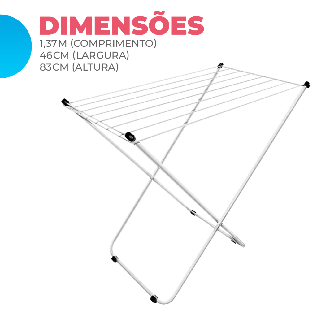 Varal de Chão Com Abas Dobrável Portátil Lavanderia Compacto Para Apartamento Secar Roupas Varanda Branco Secalux O Varal de Chão Nápoles Secalux Branco é a solução perfeita para quem busca praticidade e eficiência na hora de secar roupas, seja em apartamentos, casas ou lavanderias. Com estrutura reforçada e abas laterais dobráveis, ele oferece ampla capacidade de secagem em um formato compacto e fácil de guardar. O modelo Nápoles é ideal para secar roupas na sombra, preservando as peças do sol excessivo. Com acabamento resistente à corrosão, é durável e ideal para o uso diário. Seu sistema dobrável facilita o armazenamento em pequenos espaços quando não está em uso. Simples, funcional e eficiente para a rotina doméstica. Especificações Técnicas: • Modelo: Nápoles • Material: Aço pintado com acabamento anticorrosivo • Cor: Branco • Dobrável: Sim Dimensões Com Aba: • Comprimento: 137 cm (Com Abas Abertas) • Largura: 46 cm • Altura: 71 cm Dimensões Sem Aba: • Comprimento: 78 cm • Largura: 51 cm • Altura: 79 cm FAQ (Perguntas Frequentes): 1. Suporta roupa molhada? Sim! A estrutura é reforçada e suporta roupas leves e médias mesmo molhadas. 2. Pode ser usado em área externa? Pode, desde que em local coberto, para maior durabilidade da pintura e estrutura. 3. É fácil de guardar? Sim! O varal é dobrável e pode ser armazenado em espaços compactos. 4. Precisa de montagem? Não. O produto já vem pronto para uso – basta desdobrar e utilizar.