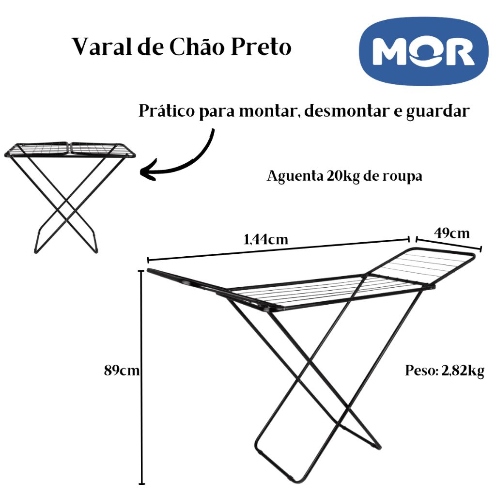 VARAL DE CHÃO COM ABAS DOBRÁVEIS SLIM - MOR PRODUTO ORIGINAL A PRONTA ENTREGA Para quem vive uma vida agitada e não pode deixar as roupas secando a céu aberto, ou para quem precisa de uma opção por conta da quantidade de roupas, o Varal de Chão com Abas Slim é ideal. Ocupa pouco espaço, é prático para montar, desmontar e guardar. Sua estrutura foi desenvolvida em tubo de aço com acabamento em pintura epóxi, que proporciona um visual moderno. Suas peças plásticas são de polipropileno, incluindo as ponteiras em seus pés que ajudam a proteger o piso. Ideal para quem busca praticidade e qualidade em um mesmo produto, o varal otimiza seu espaço distribuindo seis varetas resistentes no centro e duas abas com quatro varetas cada. Assim que recolher suas roupas, você guarda o seu varal dobrado em qualquer lugar. Perfeito para manter a organização da sua casa! VARAL PRETO: Capacidade para até 11m de roupas ou 20Kg distribuídos VARAL BRANCO: Capacidade para até 8,54m de roupas ou 15Kg distribuídos Especificações: Material - Aço Altura 89 Centímetros Largura 49 Comprimento Comprimento 1,44 Centímetros Peso 2,82 Kg MOR Sendo a maior fabricante de cadeiras de praia do Brasil, com uma estrutura voltada para altos volumes de produção, a MOR modernizou seus processos, implantando novas linhas de produção automatizada, o que gerou a fabricação e comercialização de perfis extrudados de alumínio, proporcionando maior qualidade e resistência. A armazenagem e o controle do estoque automatizado dão maior organização e agilidade na separação e no carregamento de produtos, abastecendo todas as regiões do Brasil, Mercosul e demais mercados mundiais. A MOR cumpre padrões exigentes de qualidade e controle dos seus processos, sejam eles administrativos ou de produção, assegurando a satisfação de seus clientes e consumidores.