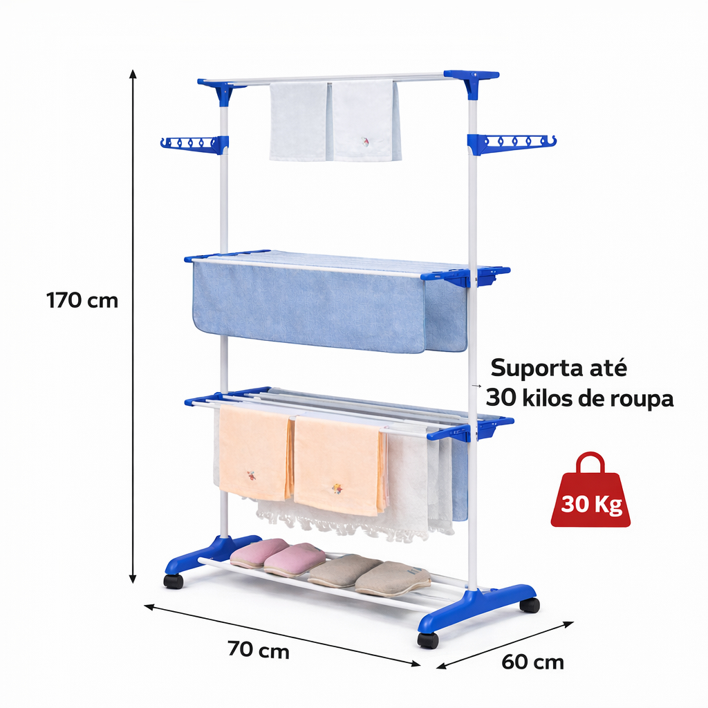 🧺 Varal de Chão Grande Dobrável com Rodinhas – 3 Andares + Abas para Cabides Organize e seque suas roupas com muito mais praticidade! O Varal de Chão Grande é ideal para quem precisa de espaço, resistência e mobilidade no dia a dia. Fabricado em aço reforçado e plástico resistente, ele possui estrutura vertical inteligente que aproveita melhor o espaço, sendo perfeito para apartamentos, lavanderias pequenas ou áreas externas. ✅ Principais Benefícios ✔ Estrutura reforçada em aço ✔ 3 prateleiras com 4 varas cada (total de 12 varas) ✔ Suporta até 10 kg por prateleira ✔ 2 abas laterais para mais de 10 cabides ✔ Barra inferior para secagem de sapatos ✔ 4 rodinhas para fácil movimentação ✔ Dobrável e fácil de guardar 📏 Dimensões do Produto Altura: 170 cm Largura: 60 cm Comprimento: 70 cm 🧵 Capacidade e Organização Cada prateleira suporta até 10 kg, oferecendo excelente resistência para: Roupas pesadas Jeans Toalhas Roupas de cama Peças delicadas As abas laterais são perfeitas para camisas, vestidos e roupas sociais em cabides, evitando marcas. 🎨 Cor Disponivel Azul com cinza 📦 Conteúdo da Embalagem 01 Varal de Chão Grande Dobrável 🏠 Ideal Para: Apartamentos Casas Lavanderias pequenas Áreas externas Uso interno e externo ✨ Mais espaço, mais organização e mais praticidade no seu dia a dia! Garanta agora o seu Varal de Chão Grande e facilite sua rotina na lavanderia.