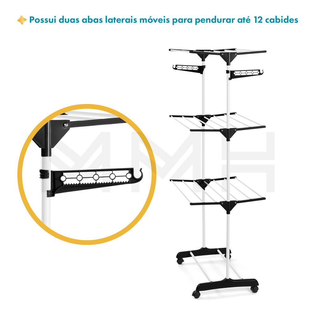 Varal De Chão Vertical 3 Andares Dobrável Aço 4 Rodas Alira Home