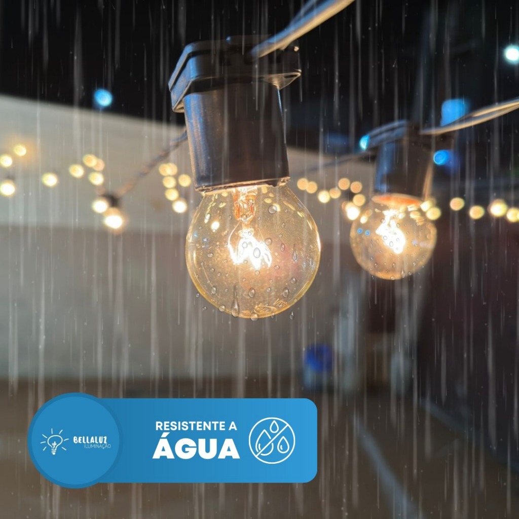 Comprimento: 25 metros - Soquete E27: Com espaço de 1 metro entre as lâmpadas - Cabo Paralelo 2x1,5mm - Voltagem do cabo: bi-volt (lembrando que o que determina a voltagem são as lâmpadas sendo 127v ou 220v) - Capacidade de watts no 220V: 1500w - Capacidade de watts no 127V: 750w - Lâmpadas compatíveis: Eletrônica, Incandescente ou LED. - Alimentação: Plug Macho já incluso (só ligar na tomada) Poderia dar uma lida nas seguintes observações? - ATENÇÃO: O varal é bi-volt, porém as lâmpadas não. *EXEMPLO: Sua rede é 127V (110V), então as lâmpadas, precisam ser 127V. - Fácil de usar viu? Ele vai pronto para uso, é só conectar o plug à tomada! - Favor atentar-se a opção "cor do varal" antes de finalizar a compra! Quais são as lâmpadas inclusas neste anúncio? - Modelo: Incandescente - Voltagem: 127 ou 220v (escolher na hora da compra) - Potência: 15w - Cor da Luz: Branco Quente (Amarelinha) - Tamanho: Aproximadamente 6,5 centímetros. Sabia que o Varal de Luzes é totalmente isolado? Isso quer dizer que ele é resistente a água, pode ficar ao tempo. Ideal para decoração e iluminação em áreas INTERNAS e EXTERNAS. Decore seu casamento, seu aniversário, seu sítio, sua varanda. Tudo fica ainda mais bonito com a iluminação do Varal de Luzes.
