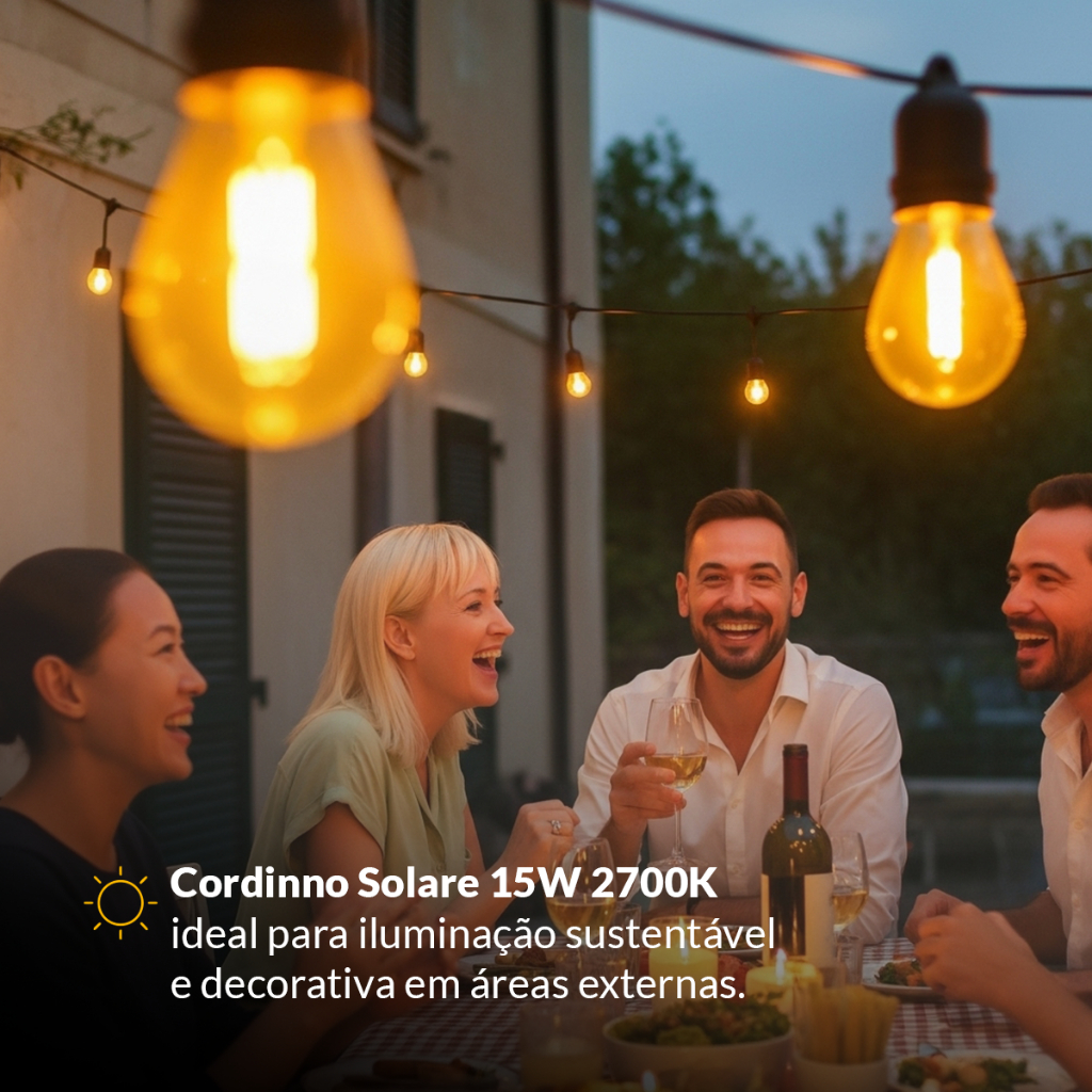 Transforme seus espaços externos em ambientes cheios de charme e economia com a Lâmpada Led Cordinha Solar 15W 2700K Branco Quente Recarregável da Alut By Avant. Esta cordinha solar é a solução ideal para quem busca uma iluminação prática, elegante e amiga do meio ambiente, sem depender da rede elétrica. Propriedades: -Potência Total: 15W -Fluxo Luminoso: 160 lúmens -Temperatura de Cor: 2700K (Branco Quente) -Tamanho: 15 metros de comprimento com 30 lâmpadas LED -Controle Remoto: Incluído -Energia Sustentável -Vida Útil Estimada: 15.000 horas (L70) -Autonomia da Bateria: Até 8 horas de iluminação contínua com carga completa. Conteúdo da Embalagem: 1 Cordinha Solar 15W + Kit de instalação (inclui painel solar). Bateria (modelo 15W): Li-Ion 18650-3.7V-1500 mAh (3 peças), recarregável via painel solar. Índice de Proteção: IP54 (Resistente a poeira e respingos d'água), ideal para uso externo. Ângulo de Abertura do Facho: 180°. Índice de Reprodução de Cor (IRC): =80. ESPECIFICAÇÕES TÉCNICAS E COMERCIAIS Material: Plástico resistente. Fator de Potência: >0,50 Frequência: 50-60Hz (referente ao circuito interno) Temperatura Ambiente de Operação: -15°C a 50°C Peso: 2230g Dimerização: Não permite dimerização. LED integrado. Uso: Externo. Garantia e Confiabilidade: Este produto conta com a Garantia Oficial da marca Alut By Avant de 12 meses (1 ano) contra defeitos de fabricação. A garantia é ativada na data da compra, mediante apresentação do Cupom ou Nota Fiscal e respeitando as condições de uso. Sobre a Alut By Avant: A Alut By Avant é a sua nova referência em soluções de iluminação inovadoras e sustentáveis. Mantendo o compromisso de qualidade e tecnologia LED da Avant, a linha Alut foca em produtos que combinam eficiência energética, design moderno e a praticidade que você precisa para iluminar com estilo, respeitando o meio ambiente.