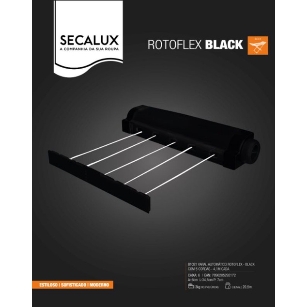 Varal De Parede Automático Rotoflex Para Apartamento Ou Casa Preto – 5 Cordas Retrátil