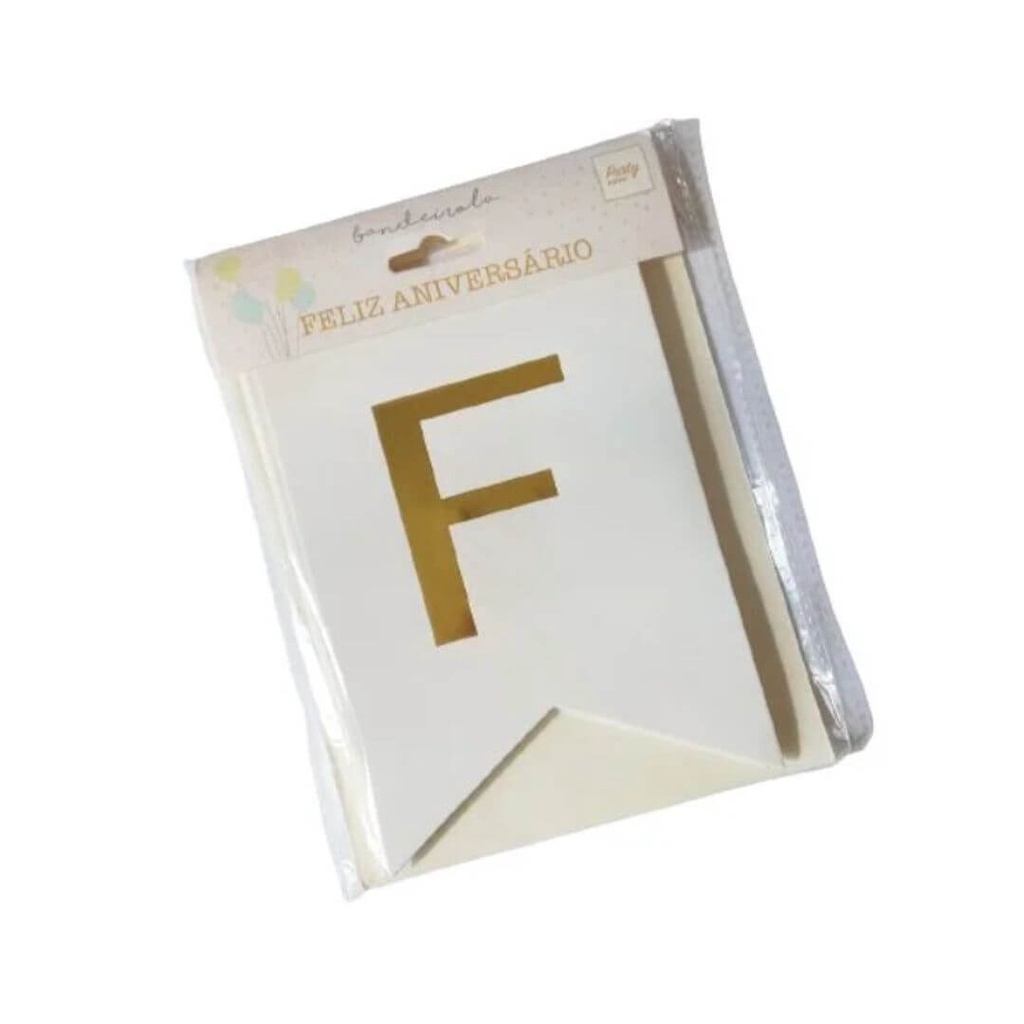 Varal Faixa Feliz Aniversário Branco e Dourado com Fitilho decoração de festa