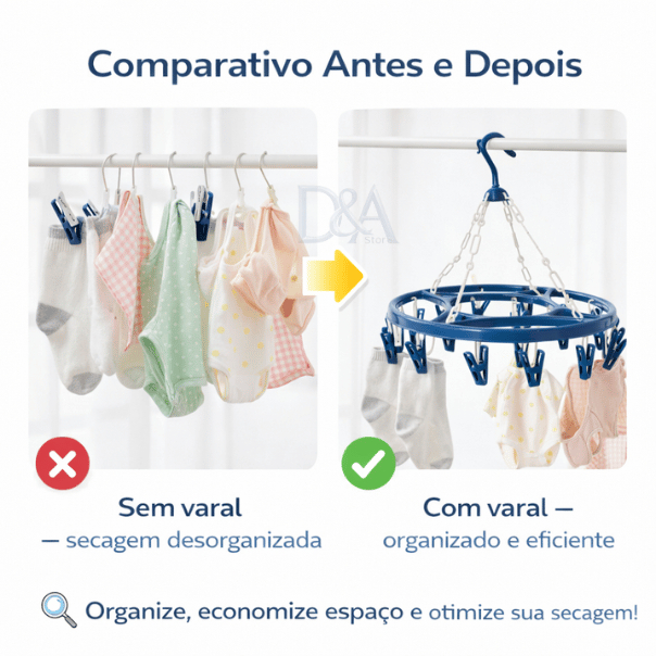 🧺 Varal para Roupas Íntimas Giratório com Prendedores Organize, economize espaço e seque suas roupas delicadas com muito mais praticidade no dia a dia! O varal giratório para roupas íntimas é ideal para meias, cuecas, calcinhas, panos, roupas de bebê e peças leves. Seu design compacto e funcional permite secagem uniforme, melhor ventilação e muito mais organização. ✅ Principais Benefícios ✔️ Design giratório 360° – facilita o acesso às peças ✔️ Prendedores firmes – não escorregam roupas leves ✔️ Economia de espaço – ideal para apartamentos e lavanderias ✔️ Leve, resistente e fácil de mover ✔️ Secagem mais rápida e organizada 📦 Escolha a Quantidade de Prendedores 👉 O anúncio possui variações de quantidade para você escolher no momento da compra: 🔹 16 prendedores 🔹 18 prendedores 🔹 20 prendedores 🔹 24 prendedores ⚠️ A cor é enviada conforme disponibilidade em estoque. 📐 Informações Técnicas Tipo: Varal giratório para roupas íntimas Material: Plástico resistente Capacidade: 16 / 18 / 20 ou 24 prendedores (conforme variação escolhida) Ideal para: Roupas íntimas, meias, panos, roupas de bebê e peças delicadas Uso: Varal de teto, área de serviço, lavanderia ou sacada 💡 Por que escolher este varal? ✔️ Mantém suas roupas organizadas ✔️ Evita marcas e deformações ✔️ Facilita o dia a dia ✔️ Ótimo custo-benefício ✔️ Produto prático para qualquer casa 🛒 Garanta já o seu! Produto prático, funcional e indispensável para quem busca organização e eficiência na secagem das roupas. 📦 Envio rápido | Compra segura | Ótima escolha para uso diário