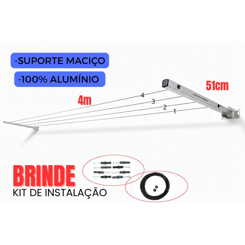 Varal Extensível de Alumínio – Alta Resistência e Durabilidade ENVIO NO MESMO DIA O Varal Extensível de Alumínio é a solução ideal para quem busca praticidade, resistência e ótimo aproveitamento de espaço. Fabricado em alumínio de alta qualidade, oferece excelente durabilidade, segurança e acabamento superior, sendo indicado tanto para ambientes residenciais quanto comerciais. Especificações Técnicas Tipo: Varal extensível Material: Alumínio de alta resistência Dimensões (aberto): 51 cm (comprimento) x 4 m (largura) Diâmetro do tubo: 1 polegada (2,5 cm) Quantidade de cordas: 4 Diferenciais do Produto Hastes com 4 furos, espaçados a cada 10 cm, proporcionando melhor organização e aproveitamento do espaço Estrutura sem rebarbas ou pontas, garantindo maior segurança no manuseio Produto robusto, resistente e com excelente acabamento Suporte maciço, assegurando maior durabilidade e firmeza Conteúdo da Embalagem 2 hastes de alumínio articuladas (51 cm cada) 8 parafusos sextavados (10 mm) – 4 para cada haste 8 buchas (10 mm) 20 metros de corda de aço encapada com PVC Ideal para quem procura qualidade, segurança e praticidade no dia a dia, este varal extensível oferece alto desempenho e longa vida útil, atendendo às necessidades dos usuários mais exigentes.