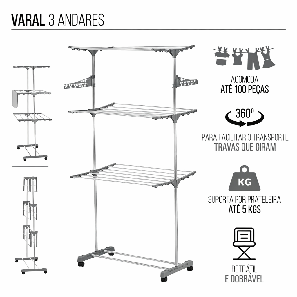 Varal Portátil 3 Andares com Suporte para Cabides – Dobrável, Compacto e Ideal para Apartamento