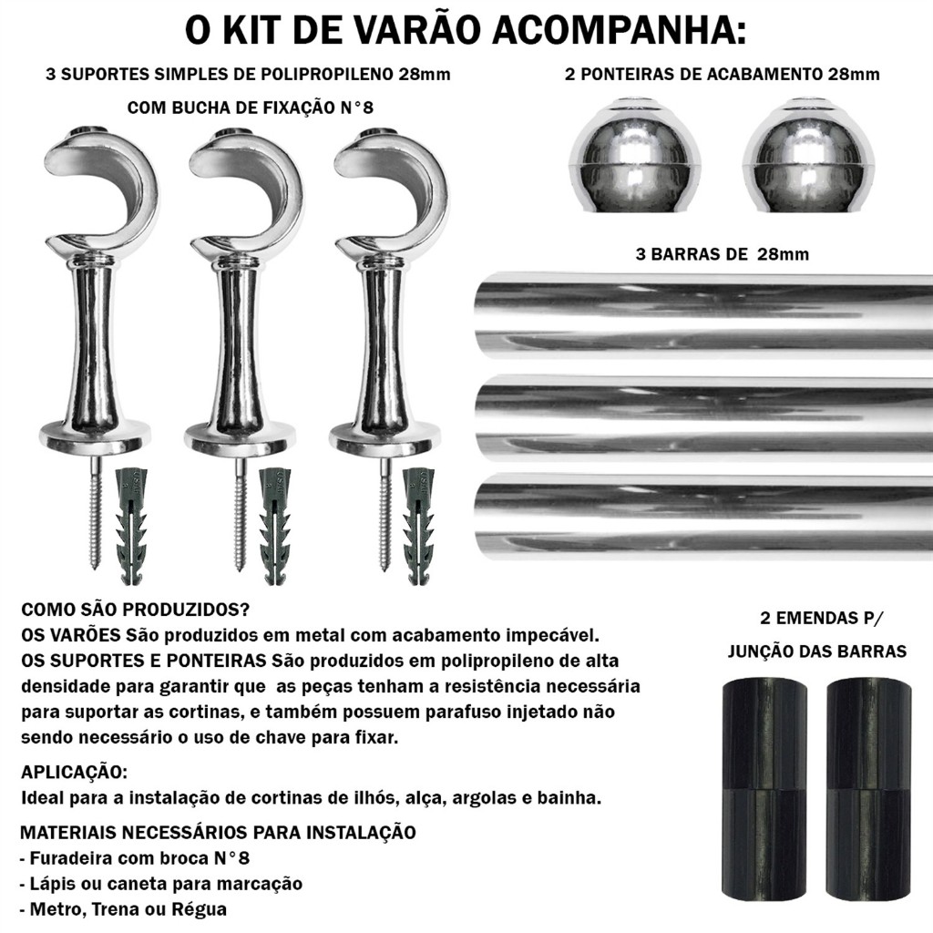 ✨ Kit Varão para cortina simples com 2,50 metros de comprimento. ✨ Composição: Varão fabricado em Aço Inoxidável, revestido em PVC Termoretrátil, garantindo qualidade e proteção a cor. Itens enviados: - 2 barras de 1,00m + 1 Barra de 50cm - 3 suportes com buchas e parafusos 8mm para instalação; - 2 ponteiras para acabamento do varão; - 2 Emendas ✅ Disponível em várias cores. ✅ Pratico de ser instalado. ✅ Produto a pronta entrega. Obs.: Sempre consultar tamanho, cor e verificar se os dados para envio estão certos para agilizar o processo de preparação. Não fazemos alteração fiscal de destinatário depois de finalizado!