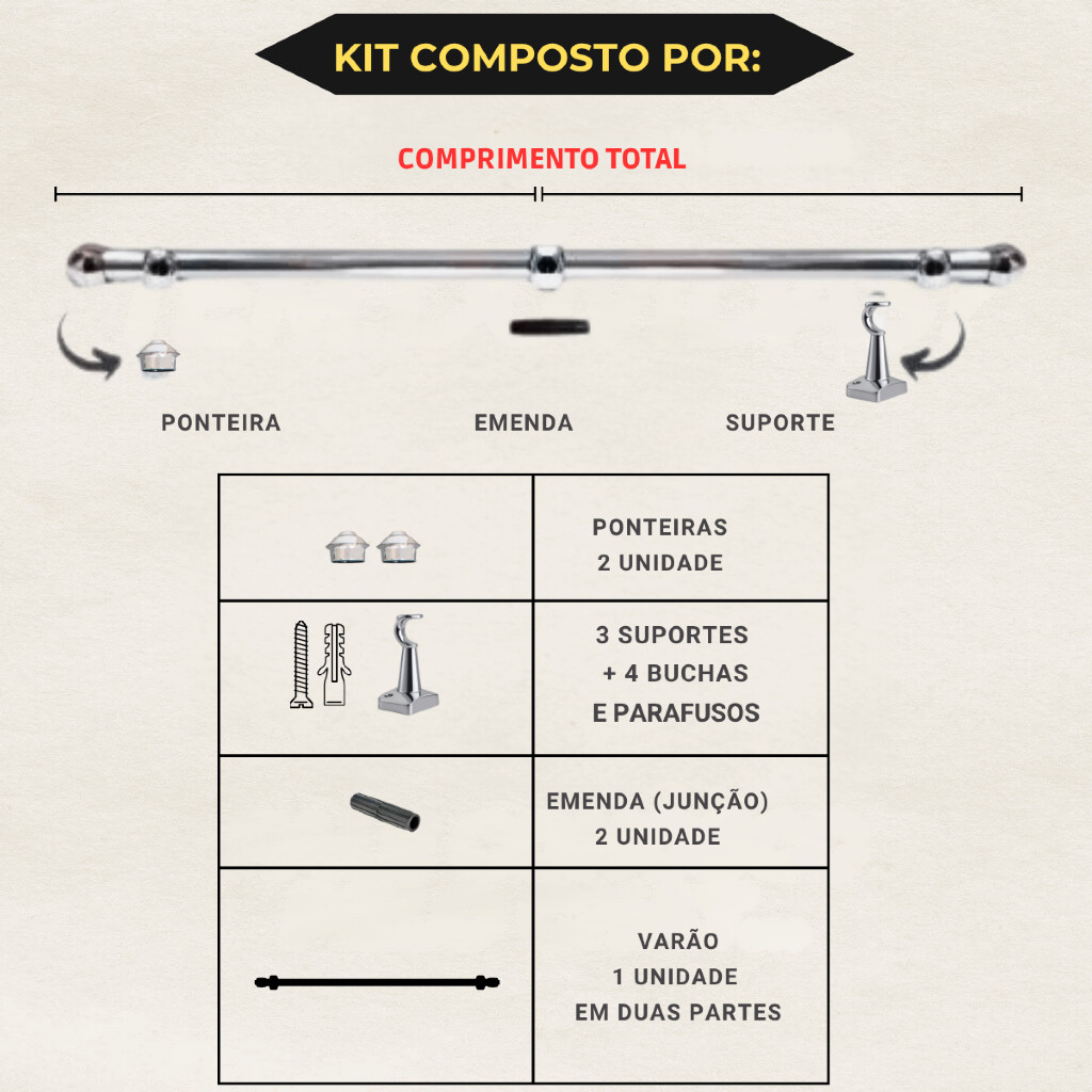 Moderno, resistente e fácil de instalar. Ideal para quem busca praticidade e acabamento elegante, esse varão simples de 28mm é perfeito para cortinas de uma camada, como voil, blackout ou tecidos decorativos. Disponível em 3 cores: Cromado Branco Tabaco (Imbuia) 🪟 Vários tamanhos disponíveis – escolha o ideal para seu ambiente no título do anúncio. Destaques do Produto: ✔️ Tamanho exato conforme o título ✔️ Alumínio polido – não desbota com o tempo ✔️ Sem rebarbas – material liso, resistente e de qualidade ✔️ Encaixe firme e seguro na junção ✔️ Produto revisado e bem embalado para evitar avarias ✔️ Entrega imediata ✨ Excelente custo-benefício para sua casa Especificações Técnicas: Tubo: Alumínio polido Suportes e ponteiras: PP (Polipropileno) Diâmetro: 28mm 📏 Até 1,50m: barra enviada inteira 📏 Acima de 1,50m: enviada em 2 partes com emenda firme 🧰 Conteúdo do Kit: 3 suportes simples 2 ponteiras 2 tubos 1 junção central (quando necessário) Parafusos com fixação central Buchas 8mm para instalação Indicado para: Cortinas de uma camada (voil, blackout, decorativas) Instalações com varão simples aparente Ambientes que exigem firmeza, funcionalidade e visual moderno