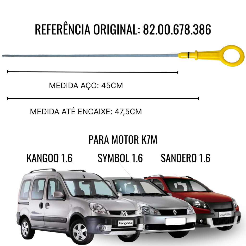 CONFIRME O MODELO ANTES DE COMPRAR; REFERÊNCIA ORIGINAL: 8200678386 / 52739-5; MEDIDA AÇO: 45CM; MEDIDA ATÉ O ENCAIXE: 47,5CM; Medição precisa do nível; Material resistente à corrosão; Bem-vindo à Cornélio Autopeças no Shopee! Somos referência em autopeças, oferecendo produtos de alta qualidade para manter seu veículo em perfeito funcionamento. 🔧 O que você encontra aqui? Peças das melhores marcas para diversas montadoras e modelos Acessórios automotivos com o melhor custo-benefício Frete rápido e seguro para todo o Brasil Atendimento especializado para tirar suas dúvidas 👉 Acesse já e garanta os melhores produtos para o seu carro! 🚗💨 ITENS INCLUSOS: 1 VARETA NIVEL DE ÓLEO - NV545; DESCRIÇÃO: A Vareta de Nível de Óleo NEVESCAR NV545 é essencial para garantir o bom funcionamento do seu veículo. Fabricada com materiais de alta qualidade, ela permite medir de forma precisa o nível de óleo do motor, evitando danos por lubrificação insuficiente ou excessiva. Compatível com diversos modelos de veículos, é resistente e durável, proporcionando segurança e praticidade na manutenção do seu automóvel. Mantenha o motor do seu carro sempre protegido e funcionando perfeitamente com a Vareta de Nível de Óleo NEVESCAR NV545. Fácil de usar e com leitura clara, é um item indispensável para quem se preocupa com o bom desempenho do veículo. Invista na qualidade NEVESCAR e tenha a tranquilidade de rodar com um motor sempre bem cuidado. VEÍCULOS COMPATÍVEIS: Renault: • Logan 2008 1.6 8V K7M anotação: 82.00.678.386 - 52739-5 - Medida Aço: 45cm - Medida até o encaixe: 47,5cm • Logan 2009 1.6 8V K7M anotação: 82.00.678.386 - 52739-5 - Medida Aço: 45cm - Medida até o encaixe: 47,5cm • Logan 2010 1.6 8V K7M anotação: 82.00.678.386 - 52739-5 - Medida Aço: 45cm - Medida até o encaixe: 47,5cm • Logan 2011 1.6 8V K7M anotação: 82.00.678.386 - 52739-5 - Medida Aço: 45cm - Medida até o encaixe: 47,5cm • Logan 2012 1.6 8V K7M anotação: 82.00.678.386 - 52739-5 - Medida Aço: 45cm - Medida até o encaixe: 47,5cm • Logan 2013 1.6 8V K7M anotação: 82.00.678.386 - 52739-5 - Medida Aço: 45cm - Medida até o encaixe: 47,5cm • Logan 2014 1.6 8V K7M anotação: 82.00.678.386 - 52739-5 - Medida Aço: 45cm - Medida até o encaixe: 47,5cm • Logan 2015 1.6 8V K7M anotação: 82.00.678.386 - 52739-5 - Medida Aço: 45cm - Medida até o encaixe: 47,5cm • Logan 2016 1.6 8V K7M anotação: 82.00.678.386 - 52739-5 - Medida Aço: 45cm - Medida até o encaixe: 47,5cm • Logan 2017 1.6 8V K7M anotação: 82.00.678.386 - 52739-5 - Medida Aço: 45cm - Medida até o encaixe: 47,5cm DADOS TÉCNICOS: VARETA NIVEL ÓLEO; Medida Aço: 45cm - Medida até o encaixe: 47,5cm; GARANTIA: 3 meses Não deixe seu carro esperando – compre agora na Shopee e garanta desempenho e durabilidade com a confiança Cornélio Autopeças! 🛒 Aproveite nossas ofertas e compre com segurança! Cornélio Autopeças – Qualidade que Move o Seu Veículo! 🚗💨