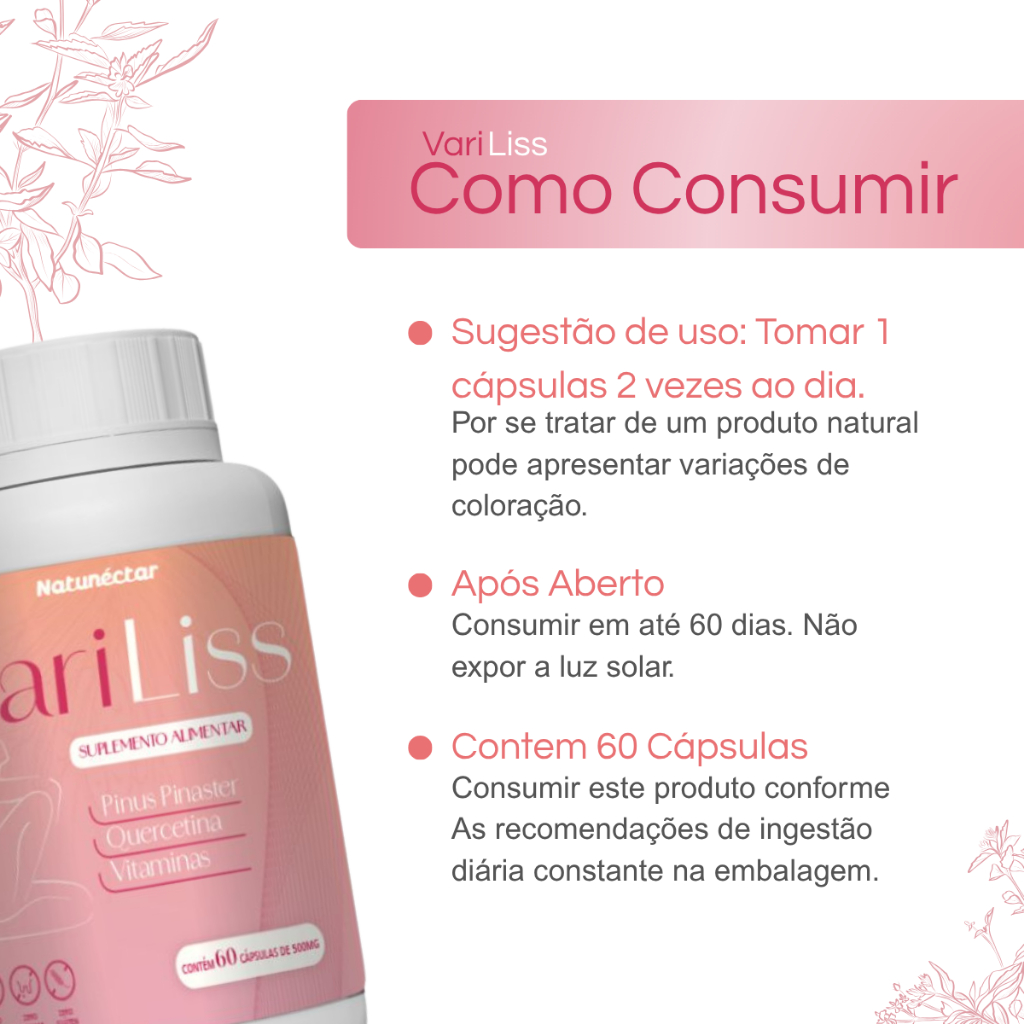DESCRIÇÃO DO SUPLEMENTO ALIMENTAR: SUPLEMENTO ALIMENTAR VARILISS COM 60 CÁPSULAS CADA POTE ATENÇÃO: PRODUTO NATURAL. COMPOSIÇÃO NUTRICIONAL: PORÇÃO DE 1G (2 CÁPSULAS) PINUS PINASTER 100MG QUERCETINA 50MG NIACINAMIDA (VIT B3) 16MG TOCOFEROL (VIT E) 10MG MENAQUINONA (VIT K2) 65MCG RUTINA (VIT P) 0,6MG INGREDIENTES: EXTRATO DE PINUS PINASTER, QUERCETINA, NIACINAMIDA, TOCOFEROL, MENAQUINONA, RUTINA 0% AÇUCAR 0% LACTOSE 0% GLÚTEN SUGESTÃO DE USO: TOMAR 1 CÁPSULA 2 VEZES AO DIA. POR SE TRATAR DE UM PRODUTO NATURAL, PODERÁ APRESENTAR VARIAÇÕES NA COLORAÇÃO. FABRICADO POR : NATUNÉCTAR PRODUTO DISPENSADO DE REGISTRO CONFORME RDC 240/2018 PRODUTO INDICADO PARA GRUPO POPULACIONAL : 19 ANOS MANTER FORA DO ALCANCE DE CRIANÇAS. NÃO EXCEDER A RECOMENDAÇÃO DIARIA ATENÇÃO : ESTE PRODUTO NÃO DEVE SER CONSUMIDO POR GESTANTES ,LACTANTES E CRIANÇAS EXCETO SOB SUPERVISÃO MÉDICA.