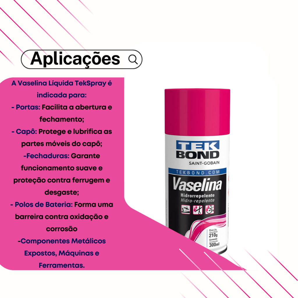 🧴 Vaselina Líquida Spray Tekbond 210g 🔧 Lubrificação e proteção duradoura para metais, borrachas e plásticos! 📦 CONTEÚDO DA EMBALAGEM 01 Vaselina Líquida Spray 210g 🏷️ Marca: Tekbond ou Koube (conforme disponibilidade) 🆕 Condição: Produto novo 🔢 Código da Peça: 23558 // 21571000488 🧪 CARACTERÍSTICAS E COMPOSIÇÃO 💧 Formulada à base de parafinas selecionadas e óleos básicos parafínicos 💦 Alta resistência à água 🛡️ Proteção contra oxidação e desgaste 🌡️ Suporta temperaturas de até 60°C ⚙️ Alto poder de lubrificação prolongada 🔧 APLICAÇÕES Ideal para uso em: 🧰 Superfícies plásticas, borrachas, vinil e couro 🚲 Bicicletas 🚗 Automóveis 🛥️ Barcos 🏠 Uso doméstico (portas, dobradiças, trilhos, etc.) 🎣 Ferragens, molinetes e carretilhas 🧑‍🔧 INSTRUÇÕES DE USO 🔄 Agite bem antes de usar 📏 Aplique a uma distância de 20 cm da superfície 🎯 Use o bico prolongador para áreas de difícil acesso ⚠️ Desligue os equipamentos energizados e aguarde a evaporação do gás antes de religá-los 📊 DADOS TÉCNICOS 👁️ Aparência: Pastosa branca sob pressão com odor característico 💧 Insolúvel em água ⚖️ Densidade (a 25°C): 0,81 a 0,91 g/cm³ 💨 Pressão Interna (a 50°C): 50 a 70 Psi 🔄 Taxa de Liberação: 60 a 80 g/min 📞 SUPORTE E HORÁRIOS DE ATENDIMENTO 🗓️ Segunda a sexta: 08h às 18:30h 🗓️ Sábados: 08h às 12h 👨‍🔧 Equipe técnica especializada à disposição para suporte e esclarecimentos! ⚠️ IMPORTANTE ❓ Antes de qualquer compra, esclareça suas dúvidas! 📜 Garantia conforme o código de defesa do consumidor.