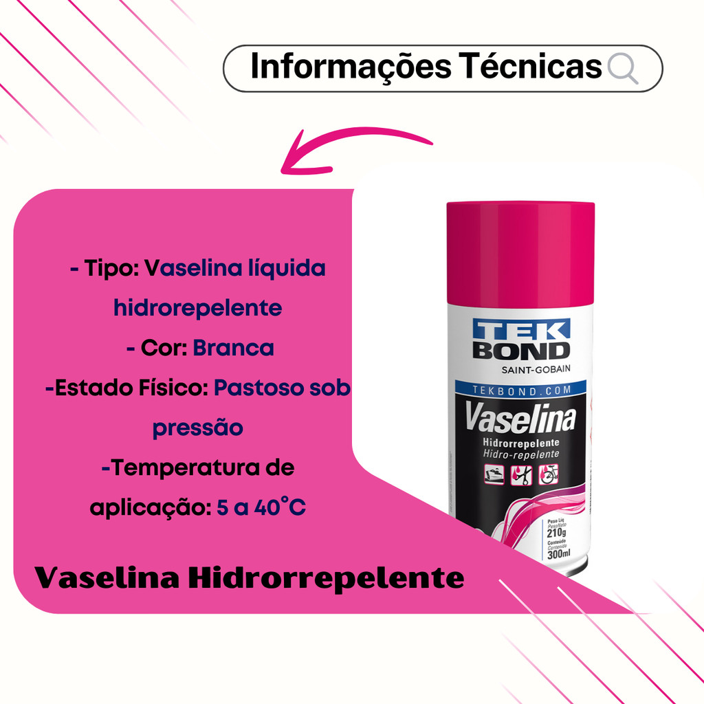 🧴 Vaselina Líquida Spray Tekbond 210g 🔧 Lubrificação e proteção duradoura para metais, borrachas e plásticos! 📦 CONTEÚDO DA EMBALAGEM 01 Vaselina Líquida Spray 210g 🏷️ Marca: Tekbond ou Koube (conforme disponibilidade) 🆕 Condição: Produto novo 🔢 Código da Peça: 23558 // 21571000488 🧪 CARACTERÍSTICAS E COMPOSIÇÃO 💧 Formulada à base de parafinas selecionadas e óleos básicos parafínicos 💦 Alta resistência à água 🛡️ Proteção contra oxidação e desgaste 🌡️ Suporta temperaturas de até 60°C ⚙️ Alto poder de lubrificação prolongada 🔧 APLICAÇÕES Ideal para uso em: 🧰 Superfícies plásticas, borrachas, vinil e couro 🚲 Bicicletas 🚗 Automóveis 🛥️ Barcos 🏠 Uso doméstico (portas, dobradiças, trilhos, etc.) 🎣 Ferragens, molinetes e carretilhas 🧑🔧 INSTRUÇÕES DE USO 🔄 Agite bem antes de usar 📏 Aplique a uma distância de 20 cm da superfície 🎯 Use o bico prolongador para áreas de difícil acesso ⚠️ Desligue os equipamentos energizados e aguarde a evaporação do gás antes de religá-los 📊 DADOS TÉCNICOS 👁️ Aparência: Pastosa branca sob pressão com odor característico 💧 Insolúvel em água ⚖️ Densidade (a 25°C): 0,81 a 0,91 g/cm³ 💨 Pressão Interna (a 50°C): 50 a 70 Psi 🔄 Taxa de Liberação: 60 a 80 g/min 📞 SUPORTE E HORÁRIOS DE ATENDIMENTO 🗓️ Segunda a sexta: 08h às 18:30h 🗓️ Sábados: 08h às 12h 👨🔧 Equipe técnica especializada à disposição para suporte e esclarecimentos! ⚠️ IMPORTANTE ❓ Antes de qualquer compra, esclareça suas dúvidas! 📜 Garantia conforme o código de defesa do consumidor.