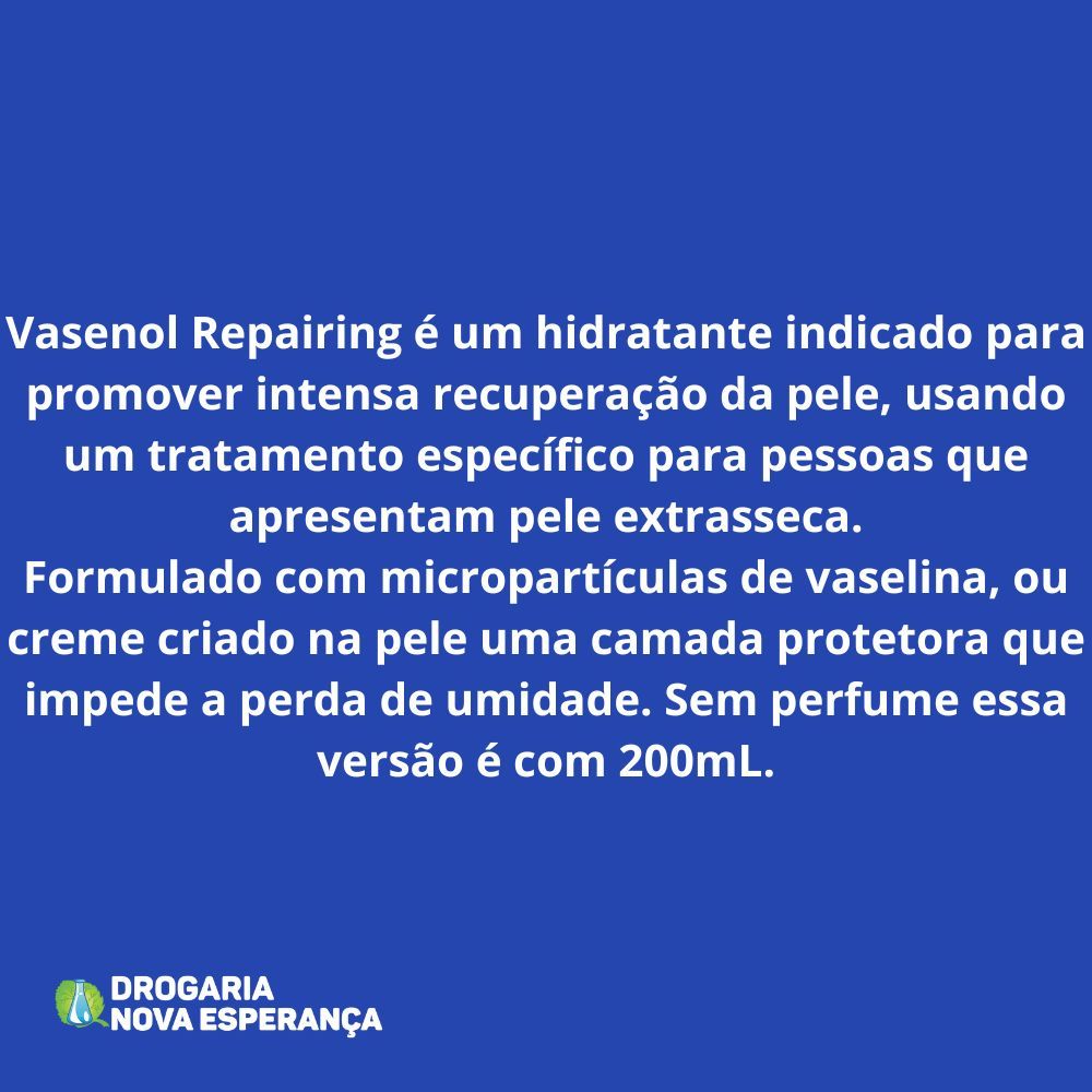 Vasenol Repairing é um hidratante indicado para: - Promover intensa recuperação da pele proporcionando um tratamento específico para pessoas que apresentam pele extrasseca.