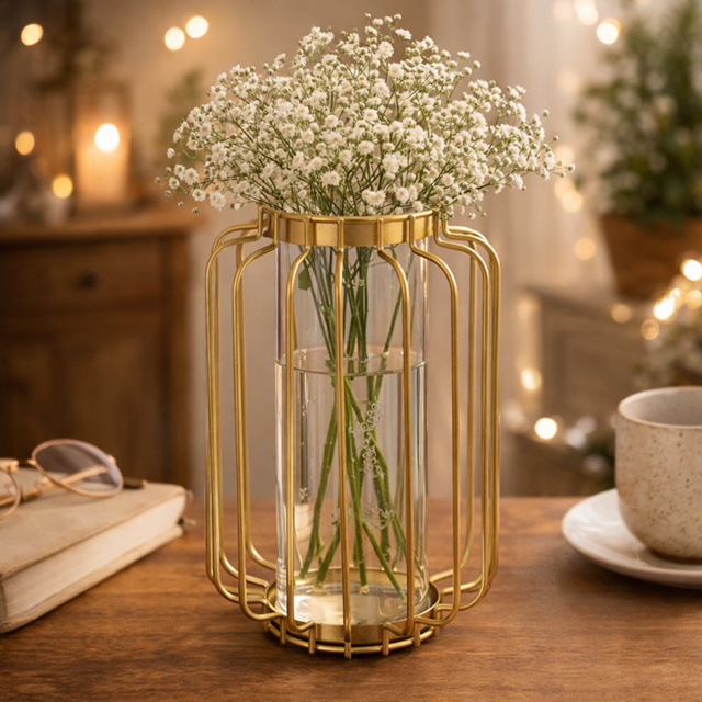 Vaso Aramado Dourado Para Flores Vaso em Arame e Vidro Vaso para Decoração Vaso de Ferro Vazado Para Planta