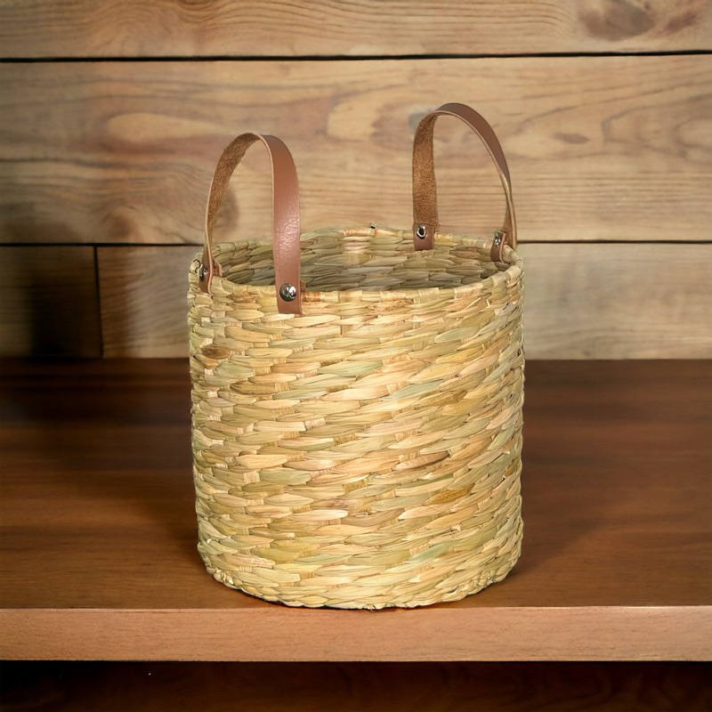 Vaso Cachepot de palha de taboa 20x20 com alça de couro