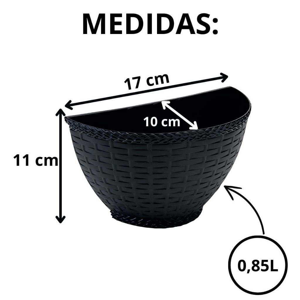 Vasos de parede Rattan "P" - Kit com 10 unidades (mesma cor). Com os vasos de parede Rattan seu ambiente ficará mais agradável e vai deixar sua casa mais bonita. Ideal para pequenos espaços. Faça seu jardim vertical, horta, suculentas, orquídeas , samambaias, bromélias, etc . Os produtos possuem um lindo design, que misturam modernidade e sofisticação, proporcionando um toque de sutileza e elegância ao seu ambiente. Medidas aproximadas: Altura: 11 cm Largura: 10 cm Comprimento: 17 cm Capacidade: 0,85L Material: Plástico (Atóxico/Não perecível) COMPRA 100% SEGURA: Somos vendedores em Marketplaces há mais de 7 anos! Manutenção e Limpeza: Limpar com um pano seco. Não usar produtos que contenham solventes, abrasivos ou amônia.