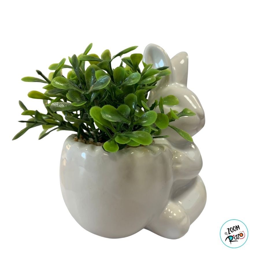 Vaso Decorativo Páscoa de Porcelana - Coelho com Planta Artificial - Branco - 10,5x10cm - 1 unidade - Rizzo