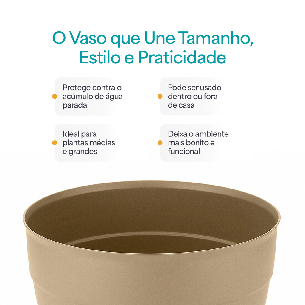 Adicione charme, funcionalidade e segurança ao seu espaço com o Vaso Redondo Plástico Extra Grande 12,5L com Prato Anti-Dengue. Ideal para uso interno e externo, é perfeito para plantas maiores, decorando seu ambiente com praticidade e protegendo contra acúmulo de água. Importante: O vaso não possui furos para drenagem, mas conta com guias marcadas no plástico, facilitando a perfuração caso desejado. Características do Produto: • Capacidade: 12,5 litros • Dimensões do Produto (A x L x C), sem a caixa de embalagem: 24,7 cm (A) x 30,6 cm (L) x 30,6 cm (C) • Material: Plástico virgem resistente e durável • Acompanha Prato Anti-Dengue: Projetado para evitar o acúmulo de água parada Design e Funcionalidade: • Formato redondo versátil para qualquer ambiente • Ideal para uso interno e externo, resistente ao sol e à chuva Benefícios: • Prevenção contra a dengue • Alta durabilidade e resistência às intempéries • Fácil de limpar • Adequado para diversas plantas e ambientes Cuidados com o Produto: • Limpar com água e sabão neutro • Evitar exposição contínua ao sol intenso para preservar as cores Conteúdo da Embalagem: • 01 Vaso Redondo Plástico Extra Grande 12,5L com Prato Anti-Dengue Bem-vindo à Ambienta Utilidades! Desde 2024, oferecemos produtos práticos e de qualidade para tornar sua casa mais funcional e acolhedora. Cada item é selecionado com atenção para garantir a sua satisfação.