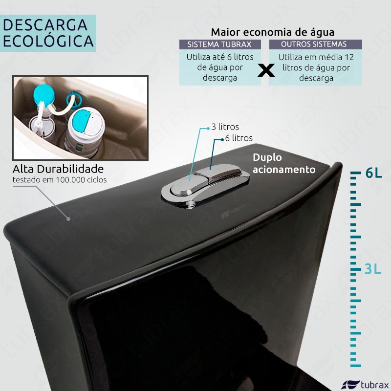 VASO MONOBLOCO MODELO UMBRA - MARCA TUBRAX Vaso sanitário com produção de alta qualidade e Design inovador, feito em peça única! Deixe o seu lavabo lindo e com aspecto de requinte com o modelo Umbra. Todos os produtos Tubrax são feitos com atenção em todos os detalhes, e o VASO SANITÁRIO Modelo Umbra não poderia ser diferente. Pensando no meio ambiente, nosso produto possui sistema de descarga ecológica com duplo comando. Em modelos comuns a descarga pode utilizar até 12 litros de água, enquanto o modelo Umbra gasta apenas 3 Litros (descarga curta) ou 6 Litros (descarga longa). Todo o nosso mecanismo de descarga possui Sistema de Alta Durabilidade, com mais de 100.000 ciclos de acionamentos comprovados. Outro diferencial aplicado em nosso produto é o sistema com Amortecedor Antirruído para o Assento, proporcionando assim, silencio em todas as descidas da tampa. Para um alto poder de limpeza, utilizamos o sistema conhecido internacionalmente Vortex® que faz um verdadeiro Turbilhão de água, sem o barulho habitual de descargas e com alto poder de sucção. ATENÇÃO: Todas as dimensões estão disponíveis nas imagens do anúncio!! Obs: Leves alterações na coloração e acabamento podem acontecer entre diferentes lotes do produto. ESPECIFICAÇÕES TÉCNICAS DO PRODUTO: - Marca: Tubrax - Modelo: Umbra - Referência do Modelo: VAB0006 - Cor: Preta - Utilização: Banheiro / Lavabo - Tipo de saída de esgoto: Vertical - Sistema Vortex® de Descarga - Assento com fechamento Amortecedor Anti-Ruído - Possui Jato Plus - Diâmetro tubulação compatível: 100 mm - Distância da parede até eixo tubulação: 30 cm - Acabamento: Esmaltado - Material: Cerâmica - Conteúdo da embalagem: 1 Vaso Monobloco com válvulas instaladas; 1 Assento com sistema Anti-Ruído; 1 Anel de vedação. - Manual: Incluso no produto (Português) - Peso bruto (com embalagem): 55 Kg - Garantia: 12 meses Porcelana, 3 meses para o assento, 6 meses para sistema de descarga.