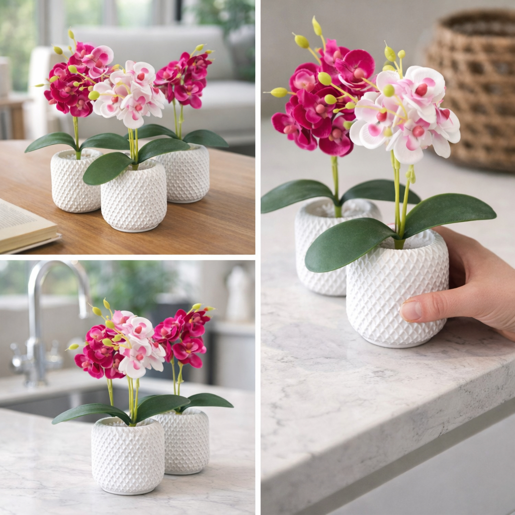 Vasos Decorativos com Orquídea Artificial em Gesso Cerâmico Branco para Sala, Escritório, Casa, Apartamento Decoração