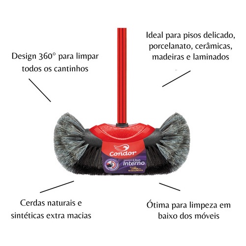 Vassoura Com Cerdas Arredondas Naturais Uso Interno Com Cabo Condor Vassoura com um mix de cerdas naturais e cerdas sintéticas macias. É ideal para pisos delicados, garantem a limpeza perfeita sem danificar os pisos de cerâmica, porcelanato, madeira e laminados. Cerdas laterais em 360 graus, com design perfeito para proteger os móveis e limpar os rodapés durante a limpeza. Especificações: - Não risca o piso - Laterais arredondadas - Ideal para limpeza em baixo de móveis - Cerdas mista: naturais e sintética - Extra macias Informações Adicionais Cores:Vermelho Comprimento (cm):32,00 Largura (cm):15,00 Altura (cm):15,00 Peso do item sem embalagem (kg):0,351 Composição :Pigmento, matéria sintética, metal, cerdas naturais e sintéticas. Acompanha: - 1 Vassoura - 1 Cabo 115cm Produto com nota fiscal