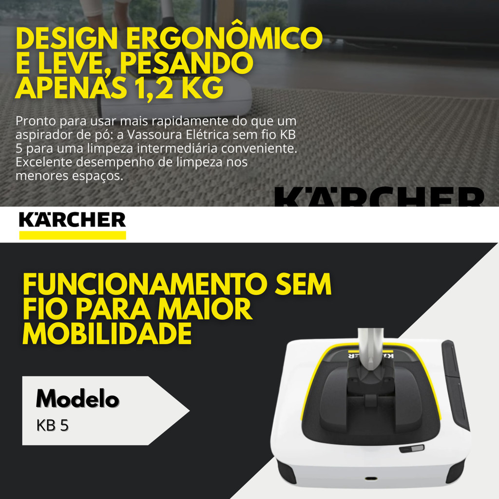 VASSOURA KARCHER KB 5 - BATERIA ..................................................................................................................................... INFORMAÇÕES SOBRE O PRODUTO ..................................................................................................................................... Limpeza Eficiente Remove sujeira e detritos de pisos frios, tapetes e carpetes baixos. - Ativação Automática Liga automaticamente ao flexionar a alça de operação. - Batería de Lítio Não vicia, com duração de até 30 minutos. - Fácil de Limpar Compartimento de detritos de fácil remoção. Sem contato com a sujeira. - Funcionamento Silencioso Limpe sua casa com tranquilidade. ..................................................................................................................................... ESPECIFICAÇÕES DO PRODUTO ..................................................................................................................................... Aplicações: Pisos frios comuns (azuleijos, porcelanato, mármore, granito). Pisos laminados, taco. Tapetes e carpetes baixos. Itens Inclusos 01 Vassoura Kärcher KB 5 01 Carregador Bivolt 01 Escova de Limpeza Cor: Branca Voltagem do Carregador (V): 127 | 220 (bivolt) Voltagem da bateria (V): 3.7 Largura de limpeza (mm): 210 Capacidade do conteiner (ml): 370 Tempo de operação (min): 20~30 Tempo de carga (h): 4 Peso (Kg): 1,2 Medidas (mm) (CxLxA): 215 x 230 x 1120 ..................................................................................................................................... DÚVIDAS FREQUENTES ..................................................................................................................................... Pergunta: Como é embalado o produto? Resposta: Todos os nossos produtos vendidos são embalados em caixas lacradas ou plástico stretch. Em respeito ao meio ambiente 90% das caixas são reutilizadas. Pergunta: Quem faz a entrega? Resposta: A entrega é terceirizada, feita via CORREIOS ou TRANSPORTADORA. Pergunta: O envio é feito em quantos dias? Resposta: Nós enviamos o seu pedido no prazo máximo de 24 horas após a confirmação de sua compra, sendo um dos envios mais rápidos da plataforma. Pergunta: Os produtos são novos ou usados? Resposta: Todos os produtos que trabalhamos são novos e com qualidade garantida. .....................................................................................................................................