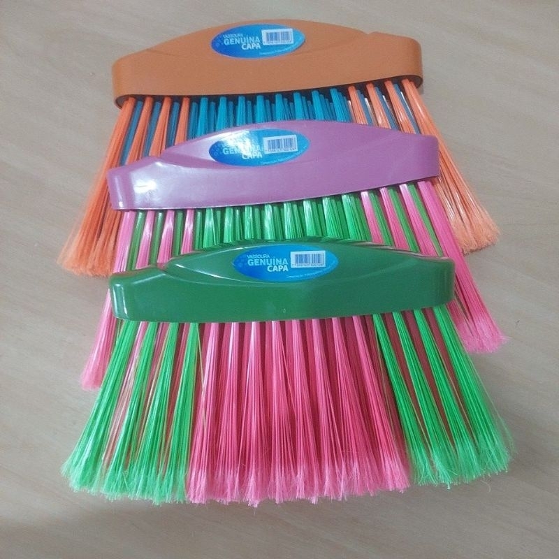 Vassoura genuína Quantidade 3 unidades Produto sem cabos. Cores variadas de acordo com estoque. Essa vassoura é um modelo popular, muito utilizado para limpezas gerais em ambientes domésticos e comerciais leves. A característica "Capa" se refere ao design da base plástica da vassoura. 🧹 Descrição da Vassoura Genuína Capa A Vassoura Genuína Capa é uma vassoura com cerdas sintéticas de alta eficiência, projetada para uma limpeza produtiva e eficaz em diversas superfícies. 🎯 Principais Características Componente Detalhe Função / Benefício Base (Capa)Plástico resistente (Polipropileno) com design que "abraça" a base das cerdas. Confere maior durabilidade e rigidez à estrutura, além de proteger o encaixe das cerdas. Cerdas de Nylon ou PET macias e prumadas (com as pontas desfiadas/plumadas) e macias/ A sua Rosca da base padrão para cabos de 23mm. (cabo não incluso nesta venda.). Permite o uso de cabos de vassoura padrão (geralmente com 22 mm de diâmetro), proporcionando flexibilidade, a base costuma ter entre 28 cm comprimento. Tamanho compacto, ideal para varrer pó, sujeiras leves e alcançar cantos e locais difíceis.