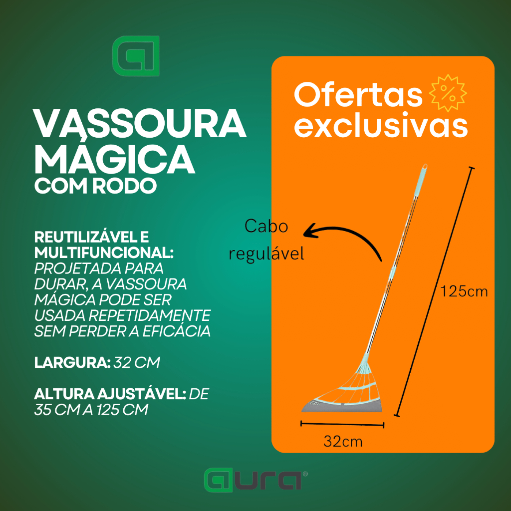 Vassoura Mágica: Limpeza Rápida e Eficaz A Vassoura Mágica é a solução ideal para uma limpeza rápida e eficiente. Com um design simples e versátil, ela oferece praticidade sem a necessidade de energia elétrica, sendo perfeita para qualquer ambiente. Além disso, é ecologicamente amigável, silenciosa e fácil de usar, o que a torna ideal para locais sensíveis ao som. Características do Produto: Funções: Varrer, limpar e esfregar Materiais: Aço inox, plástico ABS e silicone de alta resistência Reutilizável e Multifuncional: Projetada para durar, a Vassoura Mágica pode ser usada repetidamente sem perder a eficácia Dimensões: Largura: 32 cm Altura Ajustável: De 35 cm a 125 cm Conteúdo da Embalagem: 1 Vassoura Mágica A Vassoura Mágica é fácil de manter e oferece uma solução prática para a limpeza diária. Adquira já a sua e simplifique sua rotina de limpeza!