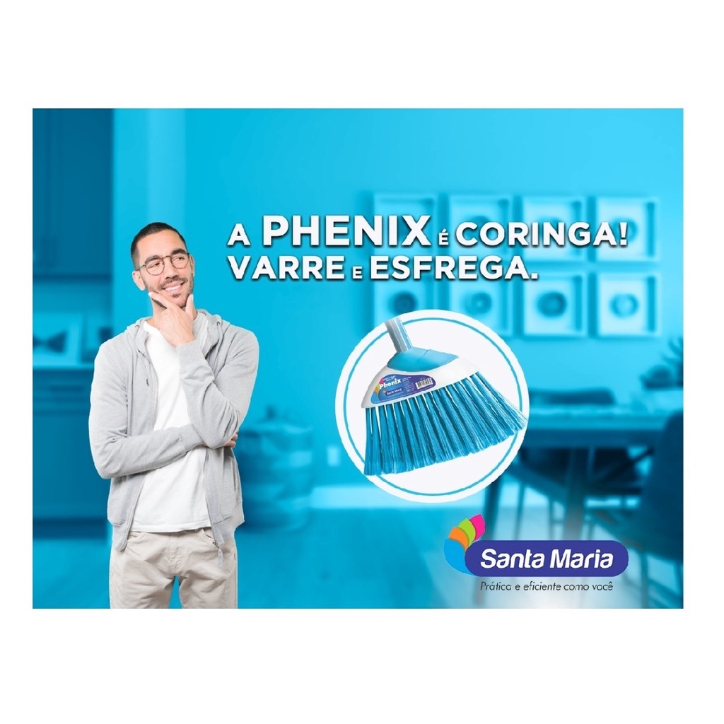 Vassoura Phenix Santa Maria limpeza delicada Vassoura Sem Cabo Principais Características:1 - Recomendada para todos os tipos de piso;2 - Design e cores que agradam;3 - Cerdas em PET 100% reciclado, ecologicamente correta;4 - Vassoura Phenix Santa Maria é considerada um coringa: varre e esfrega;5- Limpeza completa;6 - Cerdas com 11cm de altura;7 - Possui abertura para pendurar em suporte para vassoura.Descrição:Praticidade e agilidade para limpar cada cantinho da casa com muita eficiência. As vassouras são resistentes, duráveis e permitem uma limpeza completa, são produzidas com cerdas específicas para cada piso e em 100% PET, ecologicamente correto. Produtos tanto para ambientes internos como externos.