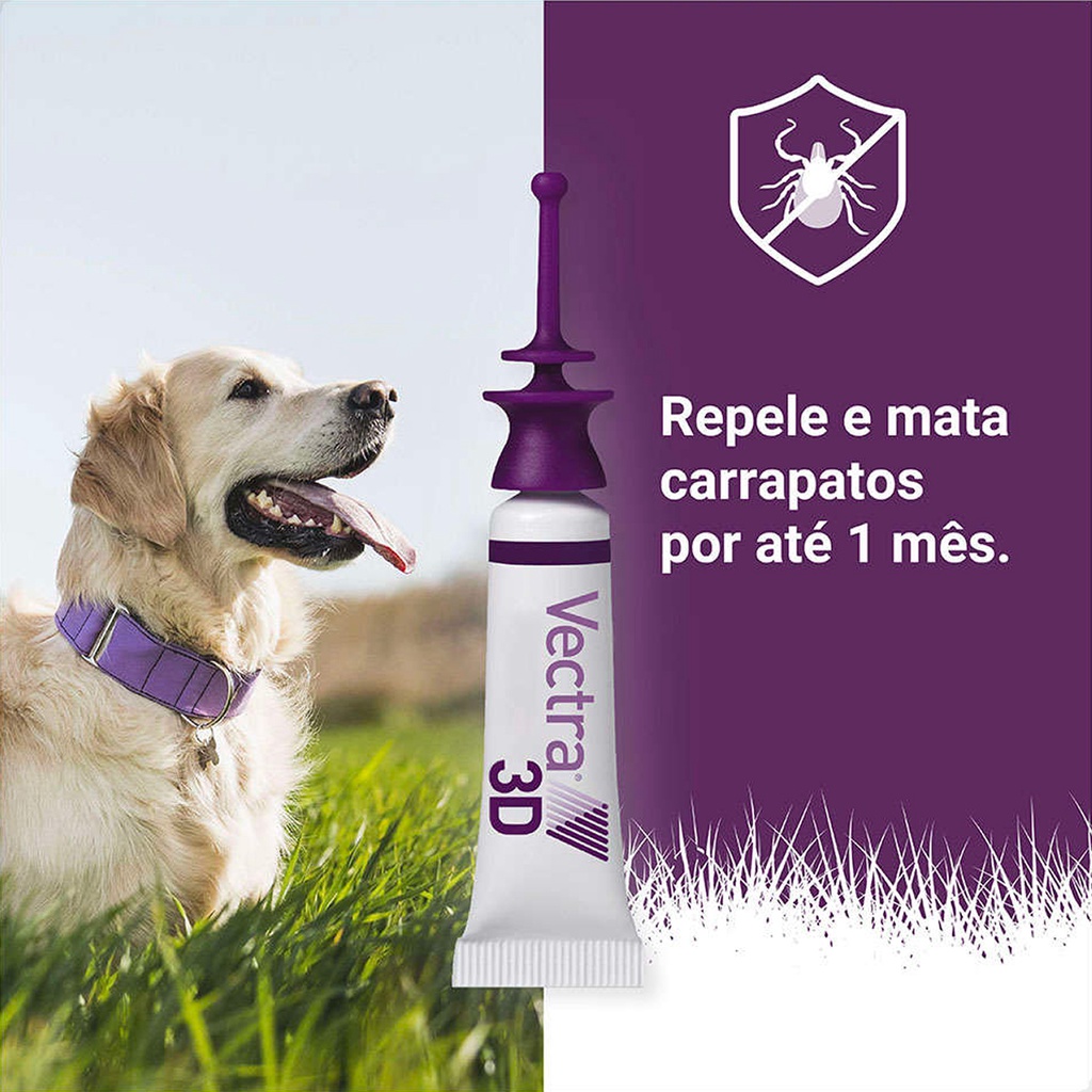 Vectra 3D Antipulgas e Carrapatos Ceva para Cães Leve 3 Pague 2 - Ação contra pulgas a partir de 5 minutos, contra carrapatos a partir de 8 horas e contra mosquitos a partir de 1 hora; - Pipeta possui ponta arredondada para fácil aplicação, não gorduroso e de secagem rápida; - Garante alta proteção contra picadas de flebótomos transmissores da Leishmaniose; - Proteção por 2 meses contra pulgas e 1 mês contra carrapatos e mosquitos; - Pode ser aplicado em filhotes de cães a partir de 7 semanas de idade; - Age por contato, melhor proteção contra transmissão de doença; - Aplicação fácil e prática, não contém aroma; - Pode ser aplicado logo após o banho. * Consulte sempre o Médico Veterinário de sua confiança para o uso apropriado deste produto. Leia a bula ou informações descritas na embalagem. Detalhes O Vectra 3D Antipulgas e Carrapatos Ceva para Cães Leve 3 Pague 2 oferece rápida proteção contra pulgas, carrapatos e mosquitos (vetores da doença do coração e da leishmaniose). Indicado para cães de 1,5 a 4 Kg. Seus componentes agem de forma conjunta e por contato, melhorando a proteção contra transmissão de doenças. Aplicação fácil e prática (com uma pipeta inovadora). Proteção por 2 meses contra pulgas e 1 mês contra carrapatos e mosquitos. Dicas Especiais Produto tópico para uso em cães. Recomenda-se aplicar o produto em animais com pele íntegra (sem lesões). A pipeta é inovadora, fácil de usar, sem gotejamento (tecnologia no-splash), sem vazar e sem a necessidade de tesoura. Com uma ponta longa e arredondada, você aplica facilmente na pele do seu pet em menos de 1 minuto. Pode ser aplicado logo após o banho. Indicação: Cachorros Porte/Raça: Raças Pequenas, Raças Médias, Raças Grandes Idade: Filhotes, Adultos, Idosos Composição: Cada 100 mL de produto contém: Dinotefuran 4,95 g, Piriproxifen 0,44 g, Permetrina 36,08 g, Excipientes q.s.p. 100 mL Apresentação: 3 pipeta de 8 mL