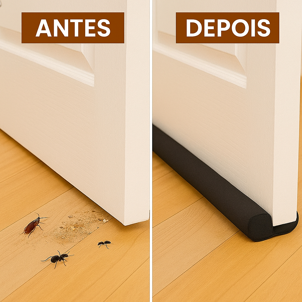 Chega de poeira, insetos e água invadindo sua casa! O Veda Porta Impermeável com Proteção Dupla é a solução prática e eficiente para vedar frestas em portas, proporcionando conforto, limpeza e economia de energia no seu ambiente. Benefícios e características Proteção dupla contra poeira, vento, barulho e respingos de água Reduz a entrada de insetos e pequenos animais indesejados Ajuda na economia de energia, mantendo a temperatura interna estável Material impermeável, resistente e de alta durabilidade Instalação fácil e rápida, sem necessidade de ferramentas Design discreto que combina com qualquer tipo de porta - Especificações técnicas Material: Courino impermeável com dupla camada de proteção Cor: Preto (neutro e elegante) Tamanhos disponíveis: 80cm, 90cm, 100cm, 110cm e 120cm Compatibilidade: Portas de madeira, alumínio ou vidro (sem soleira alta) Fixação: Deslizamento prático sob a porta (não requer cola ou parafusos) - Cuidados e orientações de uso Limpar com pano úmido e sabão neutro Evitar exposição prolongada ao sol para maior durabilidade Verificar periodicamente o encaixe para garantir a vedação Não utilizar objetos cortantes próximos ao material