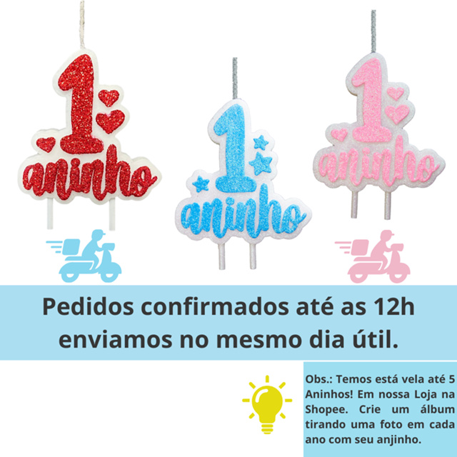 | Vela de Aniversário 1 Aninho azul rosa ou vermelha este produto | R$ 19,40 | 14% | 4.9/5 | 154 |
