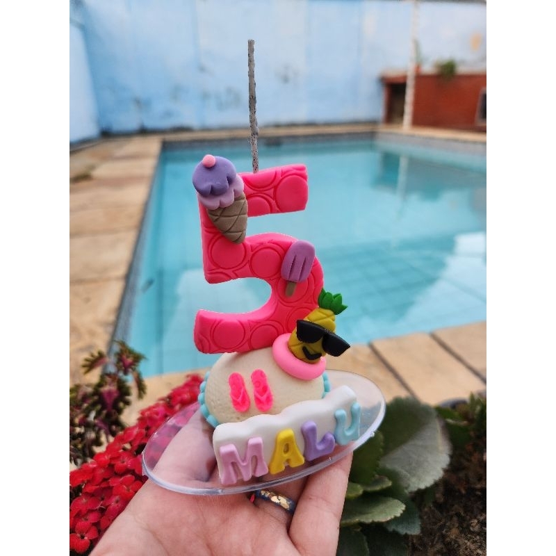 Vela de biscuit decorada no tema Pool Party Com Nome Personalizado Base acrilica 15cm Altura 11 cm. Largura 6cm. **Fazemos Todas As Numerações 1,2,3,4,5,6,7,8,9. (10 anos ou mais conferir valores). **Envie -nos por chat a idade e nome IMEDIATAMENTE após a compra para iniciarmos a produção e garantirmos o prazo de envio. - Já vai com o pavi0 mágico.- *Podem existir variações de cor devido a fotografia e tonalidades da massa. Produto artesanal todo feito a mão. Somos de Jacarepaguá-Rj Envio dentro de até 3 dias úteis