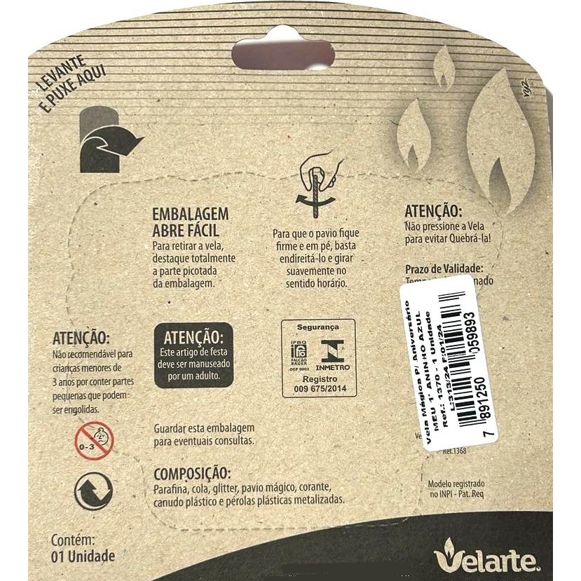Vela Especial para Festa e Bolo de Aniversário. Vendedor: Equipe Multivendas Marca: Velarte Referência: 1370 Modelo: Meu 1º Aninho Tamanho: 11,5 x 9 cm Cor: Azul com Branco Composição: Parafina, cola, glitter, pavio mágico, corante e canudo plástico. Um detalhe que vai marcar a sua festa de aniversário. Uma recordação para guardar pra toda vida. Entre em contato conosco através do campo de perguntas se tiver mais alguma dúvida sobre o prazo de recebimento ou sobre o produto. Prazo de Postagem: Até 1 dia útil após a confirmação do pagamento e a autorização de envio que é dada pelo Site. Prazo de Entrega: Ao clicar no botão de calcular o frete você verá a data prevista da entrega. Observe sempre a data máxima informada. "Somos uma empresa com sede em São Paulo capital, que atua no comércio eletrônico desde 2006. Estamos compromissados com a excelência na experiência da compra on-line, sempre buscando a satisfação dos nossos clientes aliando preço justo, rapidez no envio, qualidade nos produtos e cordialidade no atendimento". Estamos disponíveis para tirar qualquer dúvida. Aguardamos sua compra! Obrigado pela visita. EQUIPE MULTIVENDAS