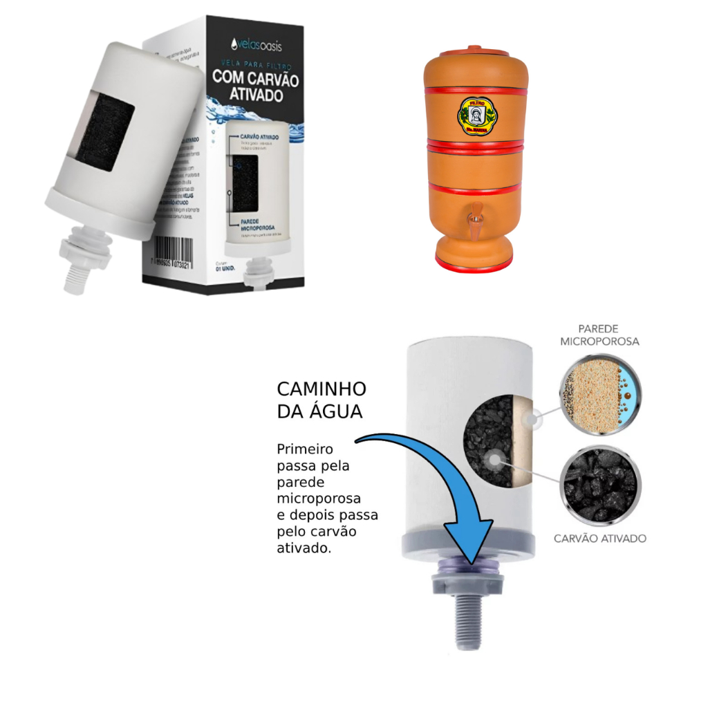 A VELA OASIS COM CARVÃO ATIVADO são fabricadas com matéria-prima de primeira qualidade, queimadas em fornos elétricos a temperaturas elevadas, portanto não estão impregnadas com nenhum odor de combustíveis, madeiras e similares, sendo um produto de alta qualidade com todas as garantias de higiene, além de ser considerada uma das mais eficientes no tratamento da água. Sua parede em material cerâmico microporoso filtra a água por gravidade, sem adição de produtos químicos, reduzindo impurezas e retendo partículas sólidas, o que garante uma água saudável e livre de micro organismos, garantindo um fluxo de filtragem altamente satisfatório para seus consumos. As velas são compatíveis com todos os filtros por gravidade do mercado e, sem dúvida, não há meio mais seguro de oferecer água pura e garantir saúde e bem-estar. BENEFÍCIOS: - Retém Partículas = 5 a <15 micra - Reduz o Cloro = 75% . - Retira gostos, odores e reduz o cloro livre. - Retém micro partículas sólidas. Dimensões da Vela: Altura do copo: 85 mm Altura total(com o bico): 120 mm Diâmetro: 60 mm