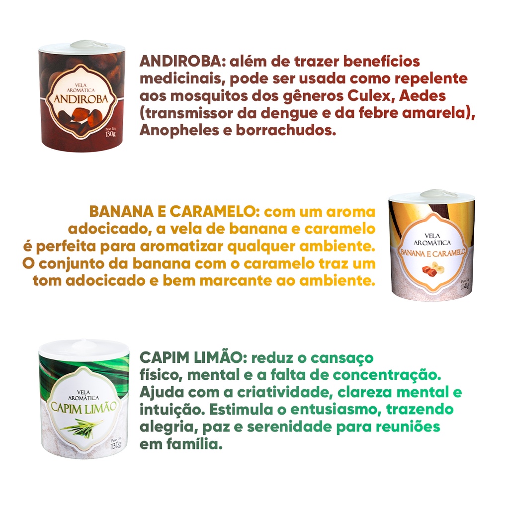 *Você deverá escolher o aroma no momento da compra. Após finalizar a compra, não conseguimos alterar os aromas escolhidos* -------------------------------------------------------------------------------------------------------- As nossas Velas Aromatizadas 130g ajudam na saúde mental e no bem-estar. Os aromas têm o poder de proporcionar um conforto invisível aos olhos, mas sentido em todo o corpo. AROMAS DISPONÍVEIS - Andiroba - Banana e Caramelo - Capim Limão - Citronela - Citrus - Flor de Algodão - Lavanda - Maçã e Canela - Mel BENEFÍCIOS DOS AROMAS - ANDIROBA: além de trazer benefícios medicinais, pode ser usada como repelente aos mosquitos dos gêneros Culex, Aedes (transmissor da dengue e da febre amarela), Anopheles e borrachudos - BANANA E CARAMELO: com um aroma adocicado, a vela de banana e caramelo é perfeita para aromatizar qualquer ambiente. O conjunto da banana com o caramelo traz um tom adocicado e bem marcante ao ambiente. - CAPIM LIMÃO: possui um aroma de ervas cítricas refrescante, perfeito para trazer ao ambiente uma sensação de estímulo e vigor. As velas de capim limão possuem efeito tônico e estimulante, indicado para pessoas depressivas e sem ânimo. Reduz o cansaço físico, mental e a falta de concentração. Ajuda com a criatividade, clareza mental e intuição. Estimula o entusiasmo, trazendo alegria, paz e serenidade para reuniões em família - CITRONELA: possui uma ação calmante e relaxante, trazendo uma sensação de limpeza e bem-estar aos ambientes da sua casa. Além disso, a vela de citronela é um repelente natural de mosquitos e pernilongos, principalmente o Aedes Aegypti, transmissor da dengue e da febre amarela - CITRUS: possui uma forte ligação com a eficiência no trabalho. Acendê-la no seu escritório ou na sua casa para trabalhar em home-office ajuda na produtividade e no rendimento. Além disso, seus aromas são ótimas fontes de energia e disposição. Seu cheiro fresco, cítrico e energizante ameniza a tristeza, combate a insônia e a depressão, ajudando no ânimo e na organização - FLOR DE ALGODÃO: possui um toque floral cítrico que traz frescor e energia ao ambiente. Por trazer tranquilidade e relaxamento, ajuda a combater a insônia. Atrai força, energia e traz uma sensação de romantismo ao ambiente - LAVANDA: é relaxante e elimina a ansiedade e o estresse. Seu perfume melhora o bem-estar das pessoas, podendo ser usado para alívio de tensão e estresse, insônia e dores de cabeça. O cheiro da lavanda pode reduzir a frequência cardíaca, ajudando a tranquilizar a mente durante seus descansos do dia. Traz boa sorte e tranquilidade aos negócios e relacionamentos - MAÇÃ E CANELA: a maçã é excelente para controlar os distúrbios emocionais e clarear a mente. A canela é estimulante, atrai novos relacionamentos, prosperidade, bons fluídos e equilíbrio emocional. O cheiro de maçã com canela ajuda a combater a enxaqueca e ainda deixa seu cérebro mais ativo - MEL: traz boa sorte e prosperidade para o ambiente. É indicada para suavizar momentos difíceis e adoçar os corações apaixonados. Promove a união e harmoniza as relações. Pacifica as brigas de casais, aguça a imaginação e libera fantasias escondidas. Para a aromaterapia, auxilia na energia positiva, acalma sintomas de resfriados, catarros e bronquites CARACTERÍSTICAS - Fabricadas com pura parafina, o que garante uma maior durabilidade, não soltando fumaça preta - Composição: Parafina, essência e pavio - Dimensões: 5,5 cm de diâmetro X 6 cm de altura - Queima: As velas duram aproximadamente 72 horas DICAS DE SEGURANÇA - Acender em recipiente de metal e superfície plana - Nunca deixe a vela queimar completamente, apague-a quando restar cerca de 5mm de cera no fundo - Não acender próximo a produtos inflamáveis - Não tire o suporte de alumínio para queimar - Manter longe do alcance de crianças e animais domésticos -------------------------------------------------------------------------------------------------------- Estamos preocupados em oferecer a você não somente um produto, mas a melhor experiência possível de compra, orientando em quaisquer dúvidas e solucionando todos os eventuais problemas. Além disso, buscamos oferecer produtos de alta qualidade com um preço acessível. Em caso de dúvidas, faça uma pergunta que estaremos sempre prontos para melhor te atender! :)