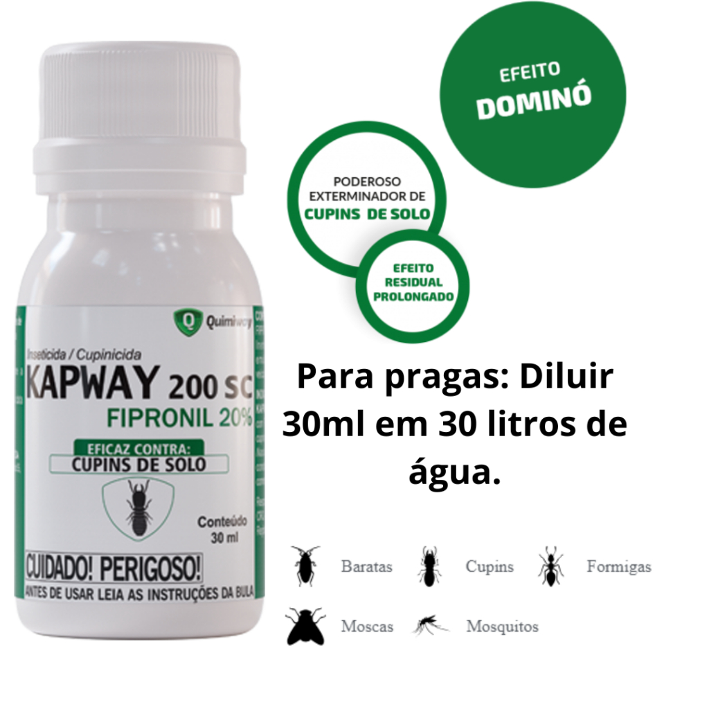 ENVIO IMEDIATO PARA TODO O BRASIL KAPWAY 200 SC 30ml O Veneno KAPWAY 200 SC 30ml é uma solução altamente eficaz para o controle de pragas, contendo o princípio ativo fipronil em uma concentração de 20%. Projetado para proporcionar resultados confiáveis e duradouros, este veneno oferece uma solução eficaz para uma ampla variedade de insetos e pragas, garantindo a proteção de residências, empresas e áreas comerciais. Características Principais: Potência Concentrada: Cada frasco de 30ml contém uma formulação altamente concentrada do veneno, com 20% de fipronil, garantindo resultados eficazes com uma pequena quantidade do produto. Ampla Eficiência: O Veneno KAPWAY 200 SC 30ml é eficaz contra uma variedade de insetos e pragas, incluindo formigas, cupins, baratas, percevejos e outras pragas comuns. Modo de Diluição: Para garantir o melhor desempenho e segurança, recomenda-se diluir 30ml do veneno em 30 litros de água antes da aplicação. Essa proporção cuidadosamente calculada maximiza a eficácia do produto e sua cobertura em áreas extensas. Fácil Aplicação: Com instruções claras e simples, o Veneno KAPWAY 200 SC 30ml é fácil de usar e pode ser aplicado em ambientes internos e externos, proporcionando uma solução conveniente e eficaz para o controle de pragas. Seguro e Confiável: Fabricado de acordo com os mais rigorosos padrões de segurança e qualidade, este veneno é seguro para uso em residências, empresas e áreas comerciais quando aplicado conforme as instruções. Resultados Duradouros: Uma vez aplicado, o Veneno KAPWAY 200 SC 30ml oferece resultados duradouros, proporcionando proteção contínua contra insetos e pragas por um longo período de tempo. Proteja seu ambiente contra insetos e pragas com a eficácia comprovada do Veneno KAPWAY 200 SC 30ml, contendo fipronil como seu princípio ativo.
