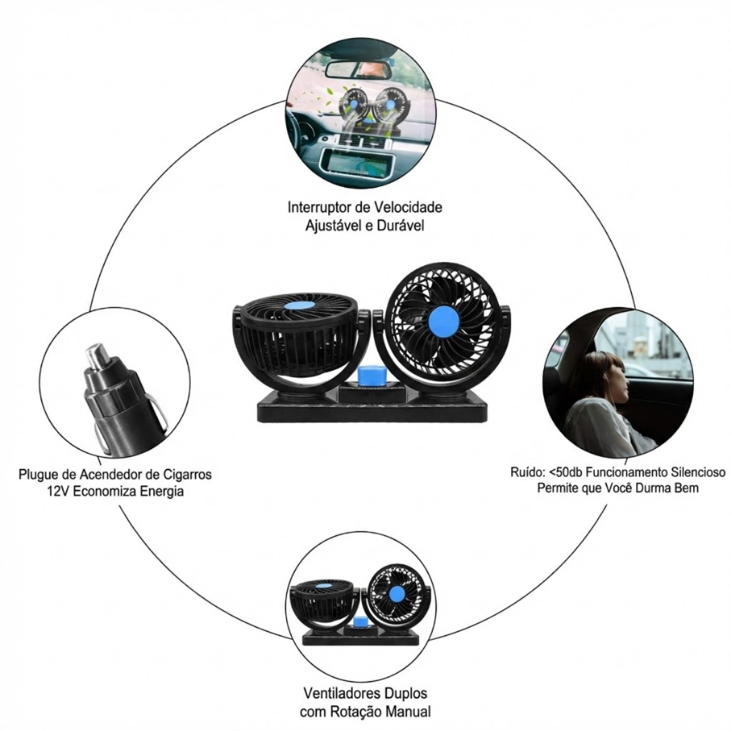 Ventilador Automotivo Duplo 12V HX-T304 – Carro, Caminhão, Ônibus, Van – Portátil, Silencioso e Ajustável O Ventilador Automotivo Duplo HX-T304 foi desenvolvido para oferecer ventilação eficiente em veículos 12V, sendo ideal para carros, caminhões, ônibus, vans e motorhomes. Compacto, leve e silencioso, ele melhora a circulação do ar, reduz o calor interno e aumenta o conforto do motorista e dos passageiros. Principais características • Ventilador duplo automotivo 12V com duas velocidades • Baixo ruído (aprox. 50 dB) • Rotação vertical de 360° e horizontal de 180° • Baixo consumo de energia • Instalação plug and play via tomada de isqueiro • Design compacto e portátil • Fixação com adesivo forte para painel ou superfícies planas Ventilação eficiente no interior do veículo O sistema de duas hélices aumenta a circulação do ar, ajudando a reduzir abafamento, odores, poeira e calor excessivo dentro do carro ou caminhão. O fluxo duplo também auxilia na distribuição do ar-condicionado, mantendo o ambiente mais equilibrado. Uso simples e instalação rápida Basta conectar na entrada do acendedor 12V e ligar. O ventilador pode ser fixado no painel ou em outra área do veículo através dos adesivos fornecidos. Não exige ferramentas nem adaptações. Ideal para diversos veículos Compatível com: • Carros e SUVs • Caminhões • Vans e utilitários • Ônibus • Motorhomes e trailers • Veículos de transporte por aplicativo Excelente também para quem viaja com crianças, pets ou passa longos períodos dentro do veículo. Especificações técnicas • Modelo: HX-T304 • Material: ABS • Alimentação: 12V (tomada de isqueiro) • Potência: 6.5 W • Ruído: aprox. 50 dB • Ajustes: 360° vertical / 180° horizontal • Velocidades: 2 níveis Conclusão O Ventilador Automotivo Duplo HX-T304 é uma solução prática, silenciosa e eficiente para melhorar a ventilação no seu carro, caminhão ou ônibus. Com design portátil, baixo consumo e ajuste total de direção do vento, ele oferece ótimo desempenho e excelente custo-benefício.