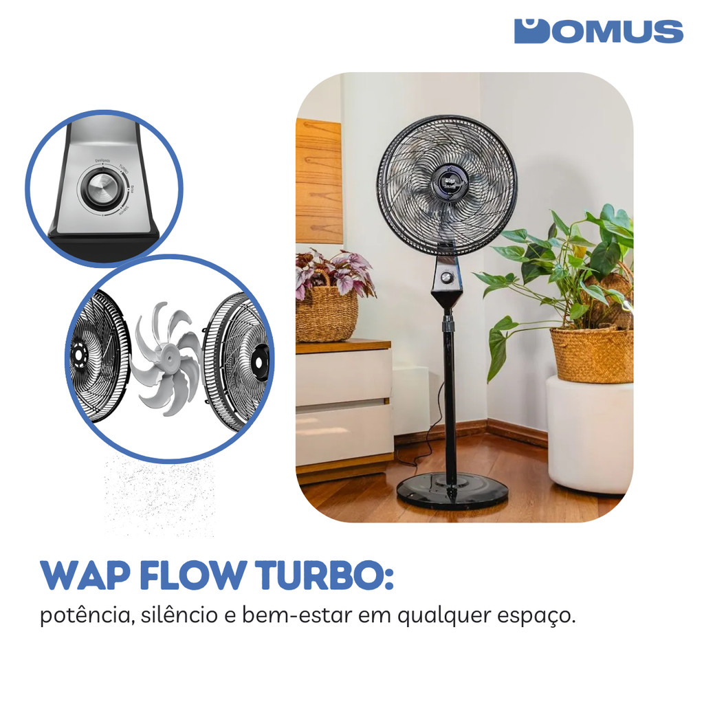 ***PRODUTO A PRONTA ENTREGA COM ENVIO IMEDIATO*** ITEM ORIGINAL COM NOTA FISCAL Somos a Domus, Loja oficial da Shopee. Temos 5 anos de experiência em E-Commerce e nosso maior objetivo é garantir a satisfação dos nossos clientes! Ventilador de Coluna WAP Flow Turbo 180W com 8 Pás e Silent Flow | 3 Velocidades | Altura Ajustável até 1,5m Mais vento, menos ruído. Sinta o conforto WAP! O Ventilador de Coluna Flow Turbo da WAP combina potência, eficiência energética e um funcionamento silencioso, ideal para manter qualquer ambiente mais agradável e ventilado. Com 8 pás aerodinâmicas e 180W de potência, proporciona excelente circulação de ar, mesmo em espaços amplos. Conta com três níveis de velocidade — Silencioso, Brisa e Turbo — que se ajustam à sua necessidade, além de oscilação horizontal de até 90° e altura regulável de até 1,5 metro. A tecnologia exclusiva Silent Flow reduz o ruído sem comprometer a performance, garantindo mais bem-estar com menor consumo de energia. Possui botão seletor de velocidade e selo Procel de eficiência energética, sendo ideal para quem busca conforto com economia. Diferenciais do produto: 180W de potência: alto desempenho com baixo consumo 8 pás com design aerodinâmico: mais vento em longa distância Tecnologia Silent Flow: mais silêncio e eficiência 3 velocidades: Silencioso, Brisa e Turbo Oscilação horizontal de até 90° Ajuste de altura: até 1,5m Baixo nível de ruído: ideal para ambientes internos Selo Procel: melhor nível de eficiência energética Base estável e design moderno Adquira agora o seu Ventilador WAP Flow Turbo e experimente um novo nível de conforto e frescor!