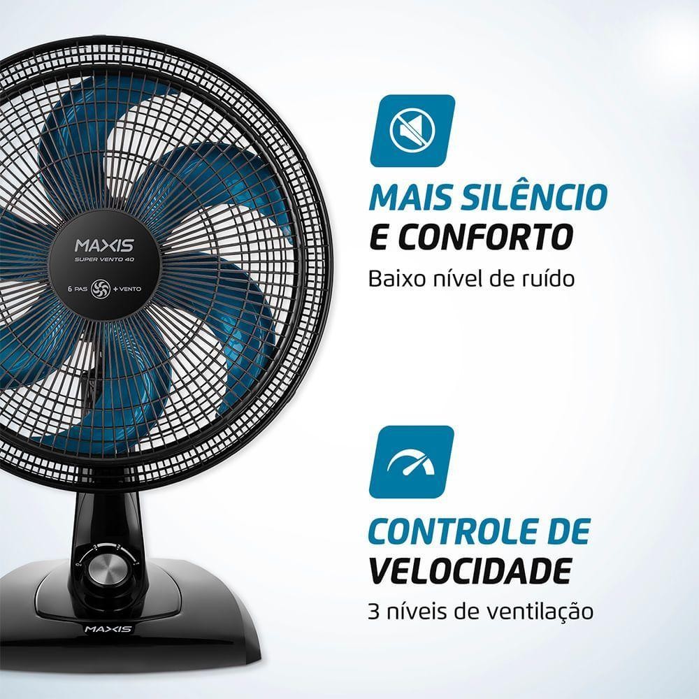 Ventilador De Mesa Maxis 6 Pás 40cm V-40-MX-B 60hz 110V O ventilador Maxis V-40-MX-B possui 40 cm de diâmetro e hélice com 6 pás, garantindo um ambiente mais refrescante e agradável para toda a sua família. Conta com Oscilação Horizontal que amplia o raio do vento no ambiente e Inclinação Vertical Regulável, perfeita para o direcionamento do fluxo de ar. Super Vento: O Ventilador Maxis possui 40cm de diâmetro e 6 Pás. O design, aliado à potência, promove maior intensidade do vento e ar mais refrescante para você e sua família. Mais Silêncio e Conforto: Possui baixo nível de ruído, assegurando o silêncio necessário para momentos de concentração e uma excelente noite de sono. Maior Distribuição De Ar: O Sistema Oscilante Contínuo amplia o raio de alcance do vento no ambiente, permitindo uma distribuição de ar mais eficiente nos cômodos da casa. Inclinação Vertical ReguláveL: Para um direcionamento ideal do fluxo do ar. Controle De Velocidade: As 3 opções de velocidade permitem adequar o vento à sua necessidade. Facilidade Na Limpeza: A grade frontal removível oferece mais facilidade na limpeza das hélices, o que simplifica a lavagem e a remoção de poeira, e garante melhor qualidade do ar. Alça De transporte: Além do design compacto, a alça traseira permite que o ventilador seja transportado entre os cômodos da casa com facilidade. Especificações Técnicas: Marca: Maxis Modelo: V-40-MX-B Cor: Preto Voltagem (Tensão): 127V ou 220V (Não é Bivolt) Potência: 140W Número de velocidades: 3 Quantidade de pás: 6 Controle remoto: Não Coluna ajustável: . Tipo de ventilador: Ventilador de mesa Peso: 2,8kg Inclinação regulável: Sim Oscilante: Sim Diâmetro: 40cm Cor das pás: Azul Dimensões do produto: 61,00cm x 45,00cm x 31,00cm (AxLxP) Itens inclusos: 01 Ventilador e 01 Manual de Instruções Garantia: 1 Ano