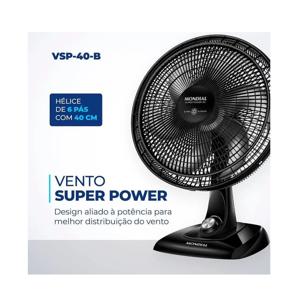 Ventilador de Mesa Mondial 40cm Preto VSP-40-B – 220 Volts O ventilador Super Power VSP-40-B possui 40 cm de diâmetro e hélice com 6 pás, garantindo um ambiente mais refrescante e agradável. Já o sistema de ventilação da Mondial apresenta baixo nível de ruído e assegura o silêncio necessário para momentos de concentração e uma excelente noite de sono. A linha de Ventiladores Super Power possui 40cm de diâmetro e 6 Pás. O design, aliado à potência, promove maior intensidade do vento e é garantia de um ambiente fresco e agradável. Mais silêncio e conforto O sistema de ventilação da Mondial apresenta baixo nível de ruído, assegurando o silêncio necessário para momentos de concentração e uma excelente noite de sono. Maior distribuição de ar O Sistema Oscilante Contínuo amplia o raio de alcance do vento no ambiente, permitindo uma distribuição de ar mais eficiente nos cômodos da casa. Inclinação vertical regulável Para um direcionamento ideal do fluxo do ar. Controle de velocidade As 3 opções de velocidade permitem adequar o vento à sua necessidade: Máxima Turbo, Média Conforto e Mínima Silencioso. Facilidade na limpeza A grade frontal removível oferece mais facilidade na limpeza das hélices, o que simplifica a lavagem e a remoção de poeira, e garante melhor qualidade do ar. Alça de transporte + porta-fio Além do design compacto, a alça traseira permite que o ventilador seja transportado entre os cômodos da casa com facilidade. Com o porta-fio embutido, você armazena o fio elétrico dentro do aparelho após o uso. Um ano de garantia mondial A Mondial é a escolha de milhões de consumidores. Mondial, a escolha inteligente! Imagens meramente ilustrativas.