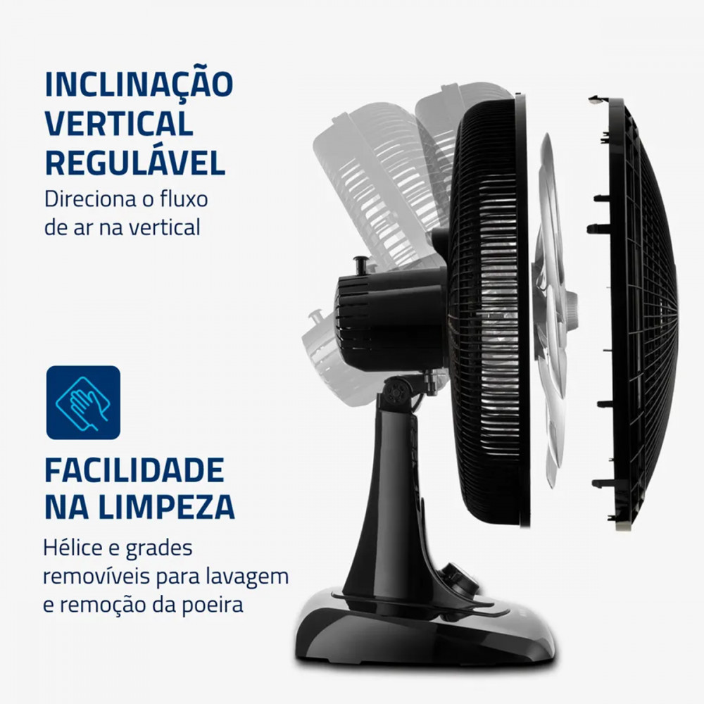 Ventilador de Mesa Mondial 40cm Super Power 220V/140W Preto - VSP-40-B Super Power A linha de Ventiladores Super Power possui 40cm de diâmetro e 6 Pás, proporcionam maior intensidade do vento e melhor distribuição de ar. O resultado é um ambiente mais fresco e arejado. Silêncio e conforto O sistema de ventilação da Mondial apresenta baixo nível de ruído, assegurando o silêncio necessário para momentos de concentração e uma excelente noite de sono. Maior distribuição de ar O Sistema Oscilante Contínuo amplia o raio de alcance do vento no ambiente, permitindo uma distribuição de ar mais eficiente nos cômodos da casa. Inclinação Vertical Regulável Para um direcionamento ideal do fluxo do ar. Controle de Velocidade As 3 opções de velocidade permitem adequar o vento à sua necessidade: Máxima Turbo, Média Conforto e Mínima Silencioso. Facilidade na limpeza A grade frontal removível oferece mais facilidade na limpeza das hélices, o que simplifica a lavagem e a remoção de poeira, e entrega uma melhor qualidade do ar. Alça de Transporte e Porta Fio Além do design compacto, a alça traseira permite que o ventilador seja transportado entre os cômodos da casa com facilidade. Com o porta-fio embutido, você armazena o fio elétrico dentro do aparelho após o uso. Especificações Marca: Mondial Modelo: VSP-40-B Cor: Preto Tensão (Voltagem) 220V Potência 140W Quantidade de pás 6 Velocidades 3 Hélices Preto Inclinação regulável Sim Oscilante Sim, horizontal Regulagem de altura Não Diâmetro das hélices 400mm Diâmetro da grade 450mm Vazão de ar 1,09 m3/s Consumo 4,12 kWh/mês Dimensões do produto (A x L x P) 61 x 45 x 30,5 cm Dimensões da embalagem (A x L X P) 31 x 50 x 51 cm Peso Líquido 2,4 kg Peso Bruto 3,1 kg Imagens de caráter ilustrativo. Informações divulgadas de acordo com o manual do fabricante. Em caso de dúvidas sobre informações técnicas, utilização, limitações e manuseio do produto, verifique o manual do fabricante. Produto novo na caixa, lacrado com NF e garantia do fabricante de 12 meses NAC013239 EAN: 7899882313598
