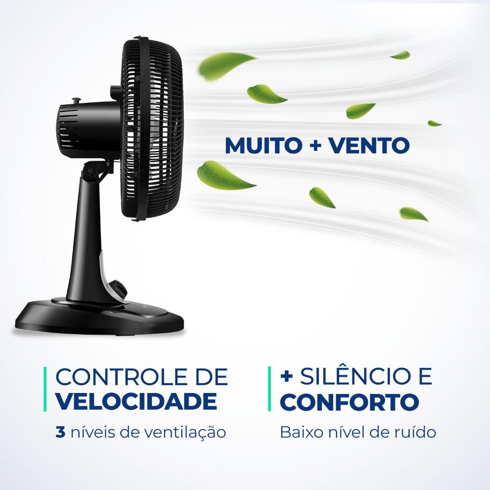 O Ventilador de Mesa Turbo VT-30-NB possui 30 cm de diâmetro, hélice com 6 pás e um design aerodinâmico que garante um ambiente mais fresco e arejado. Já o sistema de ventilação da Mondial apresenta baixo nível de ruído e assegura o silêncio necessário para momentos de concentração e uma excelente noite de sono. Especificações: - Comprimento: 38 cm - Largura: 35 cm - Altura: 60,5 cm - Peso: 2,1 kg - VENTILADOR DE 30CM + 6 PÁS: O design aerodinâmico proporciona forte ventilação e melhor distribuição de ar. O resultado é um ambiente mais fresco e agradável! - MAIS SILÊNCIO E CONFORTO: O sistema de ventilação da Mondial apresenta baixo nível de ruído, assegurando o silêncio necessário para uma excelente noite de sono. - MAIOR DISTRIBUIÇÃO DE AR: O Sistema Oscilante Contínuo amplia o raio de alcance do vento no ambiente. - INCLINAÇÃO VERTICAL REGULÁVEL: Para um direcionamento ideal do fluxo do ar. - CONTROLE DE VELOCIDADE: As 3 opções de velocidade permitem adequar o vento à sua necessidade. - FACILIDADE NA LIMPEZA: A grade desmontável oferece mais facilidade na limpeza das hélices. - COR: Preto - As configurações do seu monitor ou dispositivo móvel podem afetar a tonalidade da cor do produto. Conferir na descrição. - Produtos de Enfeite Não Estão Inclusos.
