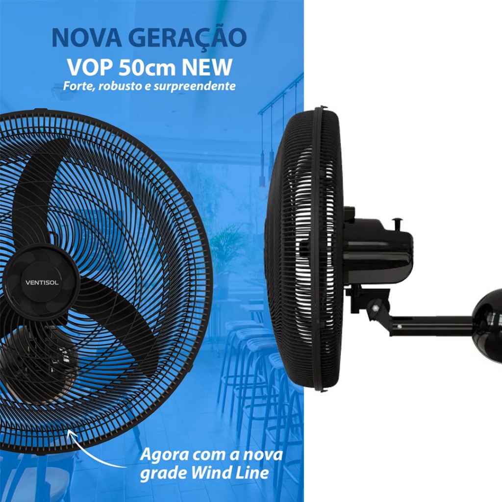 Ventilador Oscilante Parede 50Cm New PR Grade de Plástico Sua empresa ou instituição com o ar mais refrescante. Para grandes áreas que precisem de ventilação, o Ventilador de Parede Ventisol New 50cm é ideal. Indicado para grandes ambientes como lojas, escolas, restaurantes, igrejas, indústrias, entre outros. Características: - Hélices em plástico de engenharia: Além de fortes, são leves e aumentam a vida útil do motor. - Oscilação horizontal: Proporciona um fluxo de ar melhor distribuído por todo o ambiente. - Regulagem de Inclinação manual: Pode ser ajustada de acordo com a necessidade. - Pintura Eletrostática: Grade de Plástico com pintura de alta resistência. - Chave CVV: Acompanha chave de controle deslizante de velocidade. Especificações técnicas: - Voltagem: 220v - Referência: 14062 - Potência: 130 Watts - Velocidades: 3 - Vazão: 0,86 m³/ S - Grade: 500mm - RPM: 1300 - Hélice: 440mm - Consumo: 2,25 KW h/mês Conteúdo da embalagem: - 1 Ventilador - 1 Manual de Instruções