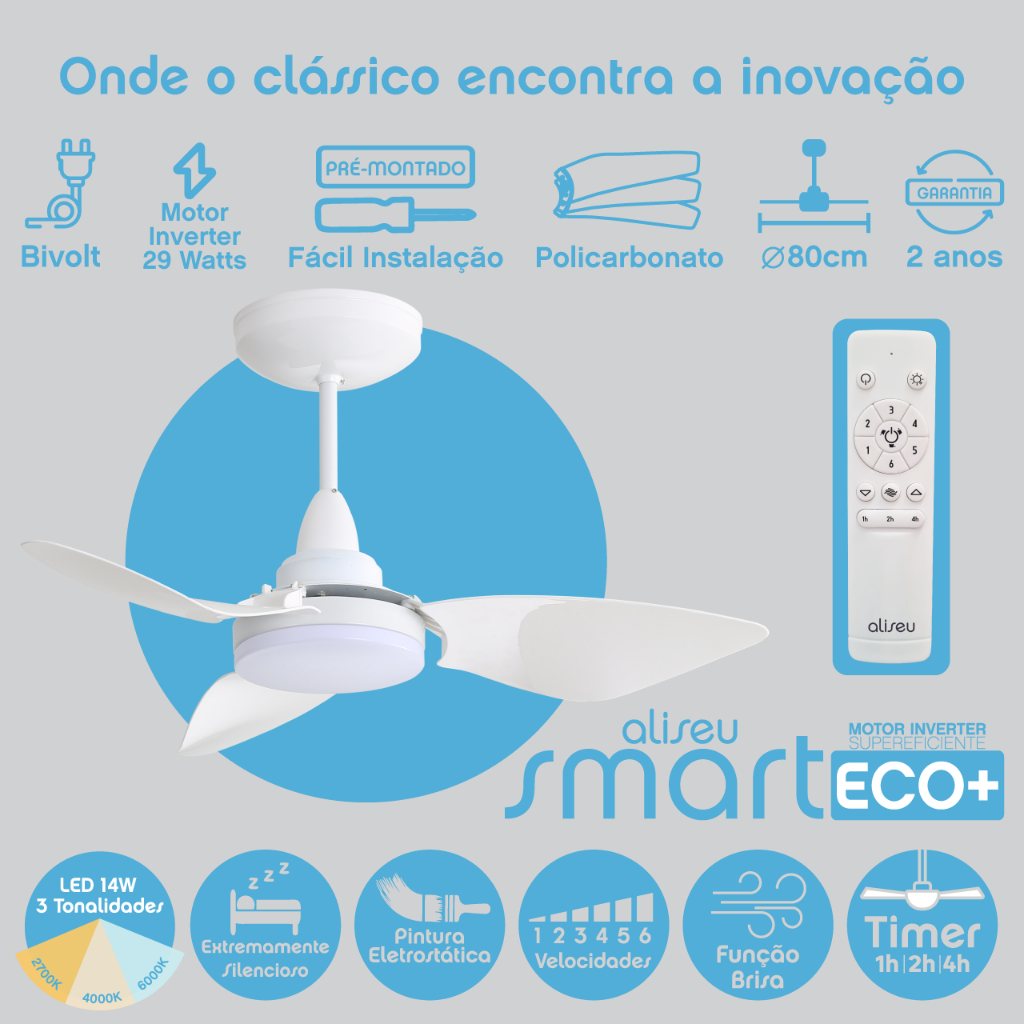 VENTILADOR DE TETO ALISEU SMART ECO+ COM MOTOR INVERTER, CONTROLE REMOTO, BIVOLT, LED INTEGRADO E MUITO MAIS! Com apenas80 cm de diâmetro, o VENTILADOR DE TETO ALISEU SMART ECO+ É IDEAL PARA QUALQUER AMBIENTE. Possui uma ótima ventilação, ALÉM DE NÃO GERAR RUÍDOS. JÁ VEM PRÉ-MONTADO E COM PROTETOR TÉRMICO NO MOTOR, GARANTINDO MAIS SEGURANÇA E DURABILIDADE. ALÉM DE TUDO ISSO, O VENTILADOR DE TETO ALISEU SMART POSSUI UMA GARANTIA DE 02 ANOS. CARACTERÍSTICAS TÉCNICAS: Acionamento: CONTROLE REMOTO que controla as velocidades, sentido de giro (ventilação ou exaustão), acendimento da luminária e tem função timer no controle remoto Rotação Máxima: 456 RPM Diâmetro: 80 cm Número de Pás: 3 Vazão Máxima de Ar: 1,81 m³/s Área de ventilação sugerida: 20 m² Voltagem: Bivolt Potência do Motor: 130 Watts Iluminação: Luminária LED integrada com 3 tonalidades – 15W COMPRE COM QUEM ENTENDE DE VENTILAÇÃO! Fundada em 1998, através da aquisição da unidade de ventiladores da Singer, a ALISEU TECNOLOGIA é uma empresa dedicada ao mercado de ventiladores de teto. SEU FOCO ESTÁ NA QUALIDADE, NO DESIGN E NA TECNOLOGIA DOS SEUS PRODUTOS, fato que pode ser confirmado pelos prêmios já recebidos, entre eles um de design de produto na Feira Industrial de Hannover e pelo PREMIO SELO PROCEL. A ALISEU SE DESTACA PELO ALTO PADRÃO DE QUALIDADE E PELO SEU EXTENSO PORTFÓLIO, que hoje conta com modelos que se adaptam as mais diversas necessidades. Atualmente, a ALISEU tem foco em continuar desenvolvendo PRODUTOS COM AS MELHORES TECNOLOGIAS E QUE ATENDAM ÀS NECESSIDADES DOS SEUS CONSUMIDORES.