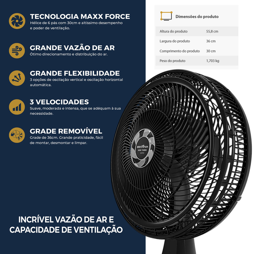 Ventilador Mesa e Parede 6 Pás 3 Velocidades 2x1 Tecnologia Maxx Force 60W BVT301 Britânia