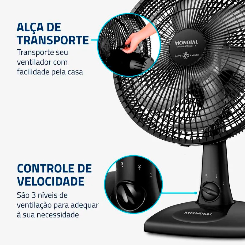VENTILADOR DE MESA MONDIAL SUPER POWER II 30CM 60W O Ventilador de Mesa Mondial Super Power II 30 cm 60W é a escolha ideal para quem busca ventilação eficiente e conforto térmico com praticidade diária. Com design moderno na cor preta, ele oferece performance potente para refrescar diversos ambientes da casa, escritório ou áreas de convivência. Desenvolvido por uma marca reconhecida pela qualidade em eletroportáteis, este ventilador alia funcionalidade, durabilidade e baixo nível de ruído para tornar seu dia mais confortável. VENTILAÇÃO POTENTE Equipado com motor de 60 W e hélice de 30 cm de diâmetro com 6 pás, o ventilador proporciona um fluxo de ar intenso que ajuda a combater o calor de forma eficiente, garantindo conforto em dias quentes. VELOCIDADES AJUSTÁVEIS Possui 3 níveis de velocidade, permitindo ajustar a intensidade do vento conforme a necessidade e o ambiente. Desde uma brisa suave até uma ventilação mais forte e direta. CONFORTO COM BAIXO RUÍDO Projetado para funcionar com nível de ruído reduzido, este ventilador é ideal para uso durante o sono, estudos ou trabalho, oferecendo frescor sem causar incômodo sonoro. OSCILAÇÃO E DIRECIONAMENTO A função de oscilação horizontal distribui o ar de maneira mais uniforme por todo o ambiente, enquanto a inclinação vertical ajustável permite direcionar o fluxo de ar com precisão para onde você mais precisa. FÁCIL DE LIMPAR As grades frontal e traseira podem ser removidas, facilitando a limpeza e manutenção do produto, o que contribui para melhor desempenho e maior durabilidade. PORTABILIDADE E DESIGN Compacto e leve, com alça de transporte integrada, o ventilador pode ser facilmente movido entre cômodos conforme sua necessidade. Seu visual em preto combina com diferentes estilos de decoração. MARCA DE CONFIANÇA Mondial é uma marca amplamente conhecida no Brasil pela qualidade de seus produtos e tradição no segmento de eletroportáteis, garantindo mais segurança e satisfação na sua escolha. ESPECIFICAÇÕES TÉCNICAS - Marca: Mondial - Modelo: Super Power II - Tipo: Ventilador de mesa - Diâmetro da hélice: 30 cm - Quantidade de pás: 6 - Potência: 60 W - Níveis de velocidade: 3 - Oscilação horizontal: Sim - Inclinação vertical ajustável: Sim - Alça de transporte: Sim - Nível de ruído: baixo - Cor: Preto - Voltagem: 220 V (não é bivolt) - Garantia: 12 meses pelo fabricante DIMENSÕES DO PRODUTO SEM EMBALAGEM - Altura: 49 cm - Largura: 35 cm - Profundidade: 24,5 cm - Peso: 1,7 kg DIMENSÕES DO PRODUTO COM EMBALAGEM - Altura: 50 cm - Largura: 36 cm - Profundidade: 26 cm - Peso: 2,0 kg CONTEÚDO DA EMBALAGEM - 01 Ventilador de Mesa Super Power II Mondial - 01 Manual de instruções Um ventilador versátil, silencioso e eficiente, ideal para tornar seus ambientes mais frescos e agradáveis com praticidade e qualidade.