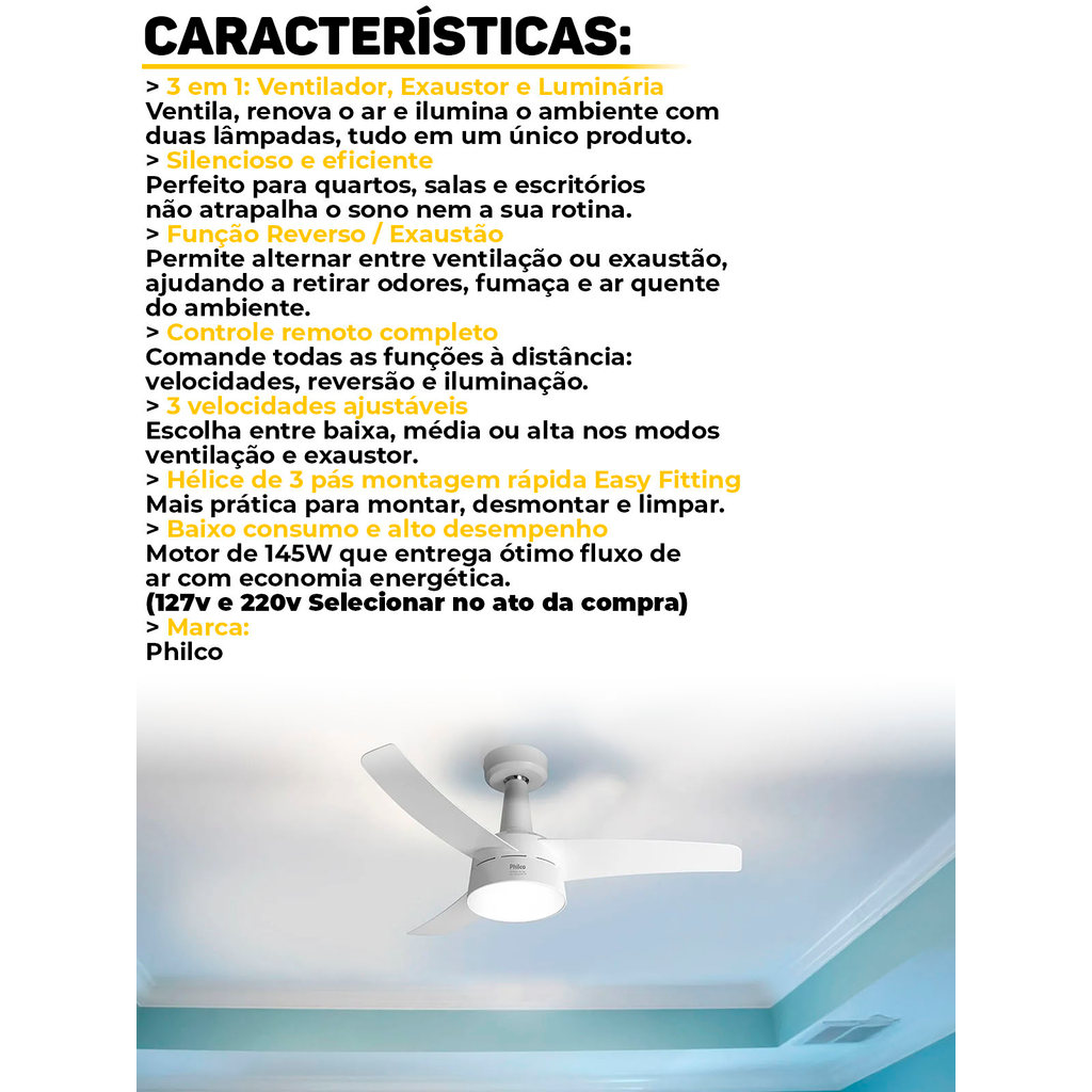 Ventilador Teto Philco PVT07B 3 Em 1 Reverso Luminária Easy Fitting Casa Escritório Sala