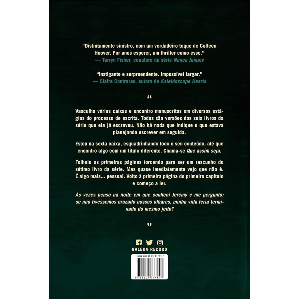O amor é capaz de superar a pior das verdades?Verity Crawford é a autora best-seller por trás de uma série de sucesso. Ela está no auge de sua carreira, aclamada pela crítica e pelo público, no entanto, um súbito e terrível acidente acaba interrompendo suas atividades, deixando-a sem condições de concluir a história... E é nessa complexa circunstância que surge Lowen Ashleigh, uma escritora à beira da falência convidada a escrever, sob um pseudônimo, os três livros restantes da já consolidada série. Para que consiga entender melhor o processo criativo de Verity com relação aos livros publicados e, ainda, tentar descobrir seus possíveis planos para os próximos, Lowen decide passar alguns dias na casa dos Crawford, imersa no caótico escritório de Verity – e, lá, encontra uma espécie de autobiografia onde a escritora narra os fatos acontecidos desde o dia em que conhece Jeremy, seu marido, até os instantes imediatamente anteriores a seu acidente – incluindo sua perspectiva sobre as tragédias ocorridas às filhas do casal. Quanto mais o tempo passa, mais Lowen se percebe envolvida em uma confusa rede de mentiras e segredos, e, lentamente, adquire sua própria posição no jogo psicológico que rodeia aquela casa. Emocional e fisicamente atraída por Jeremy, ela precisa decidir: expor uma versão que nem ele conhece sobre a própria esposa ou manter o sigilo dos escritos de Verity? “Distintamente sinistro, com um verdadeiro toque de [Colleen] Hoover. Estive esperando um thriller como esse por anos.” – Tarryn Fisher, coautora da série Nunca Jamais
